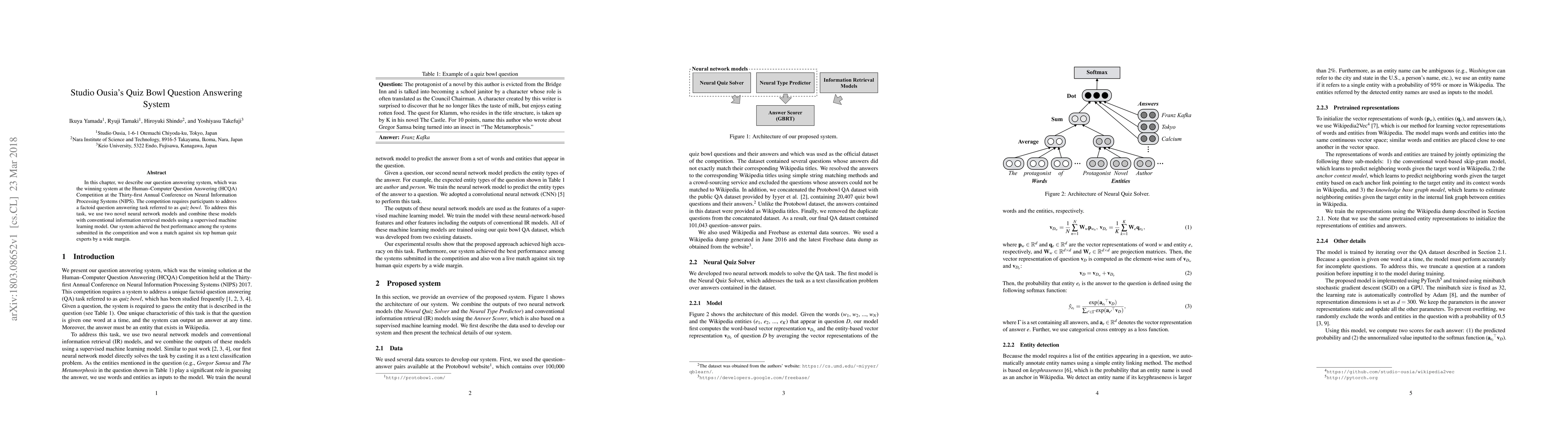 Studio Ousia developed a question answering system that won the NIPS HCQA Competition, outperforming human quiz experts. It combined novel neural networks with traditional information retrieval models.