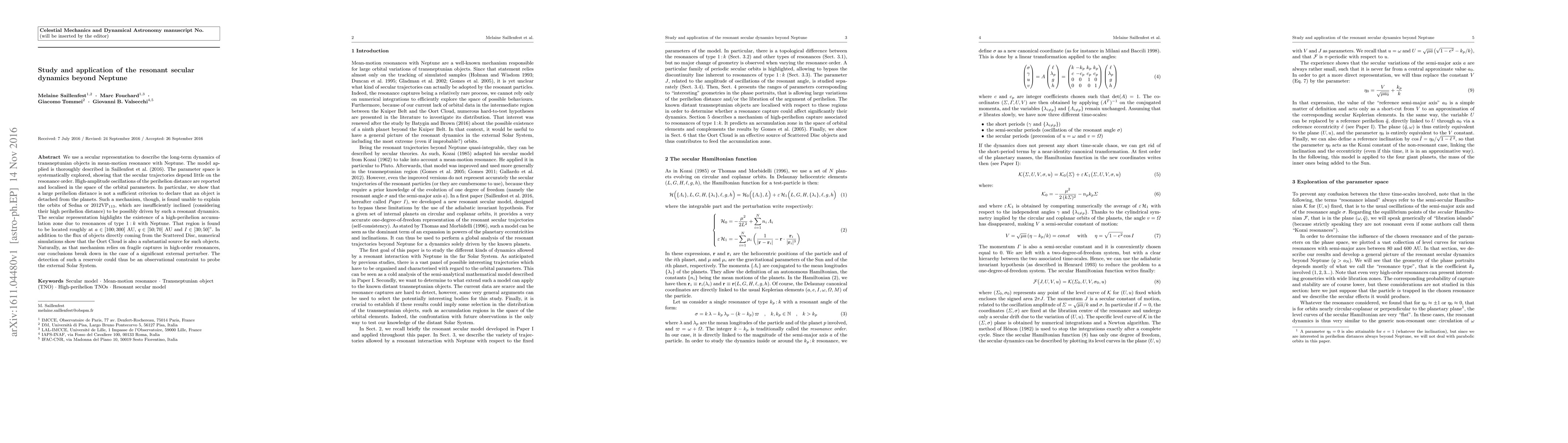 We use a secular representation to describe the long-term dynamics of transneptunian objects in mean-motion resonance with Neptune. The model applied is thoroughly described in Saillenfest et al. (2016). The parameter space is systematically explored, showing that the secular trajectories depend little on the resonance order. High-amplitude oscillations of the perihelion distance are reported and localised in the space of the orbital parameters. In particular, we show that a large perihelion distance is not a sufficient criterion to declare that an object is detached from the planets. Such a mechanism, though, is found unable to explain the orbits of Sedna or 2012VP113, which are insufficiently inclined (considering their high perihelion distance) to be possibly driven by such a resonant dynamics. The secular representation highlights the existence of a high-perihelion accumulation zone due to resonances of type 1:k with Neptune. That region is found to be located roughly at semi-major axes in [100;300] AU, perihelion distances in [50;70] AU and inclinations [30;50]{\deg}. In addition to the flux of objects directly coming from the Scattered Disc, numerical simulations show that the Oort Cloud is also a substantial source for such objects. Naturally, as that mechanism relies on fragile captures in high-order resonances, our conclusions break down in the case of a significant external perturber. The detection of such a reservoir could thus be an observational constraint to probe the external Solar System.