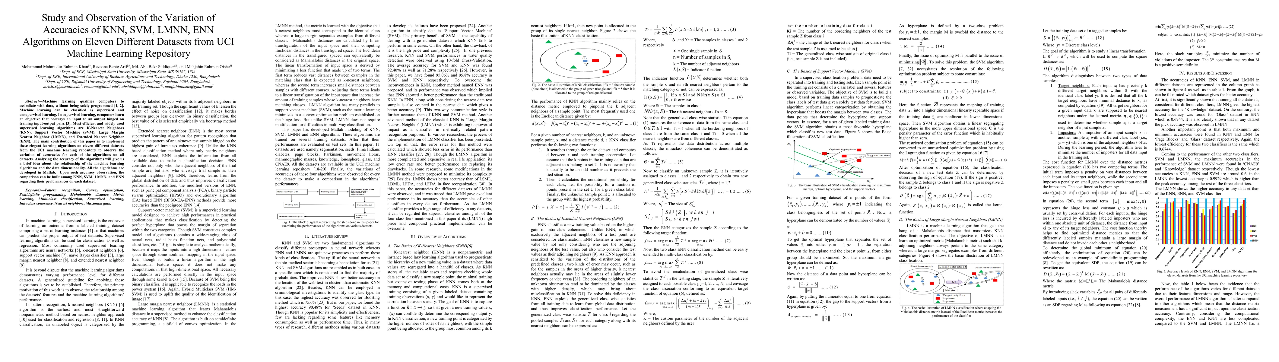 This study compares the performance of KNN, SVM, LMNN, and ENN algorithms on 11 different datasets from the UCI machine learning repository, analyzing their accuracy variations to understand relationships between data dimensionality and algorithm performance.