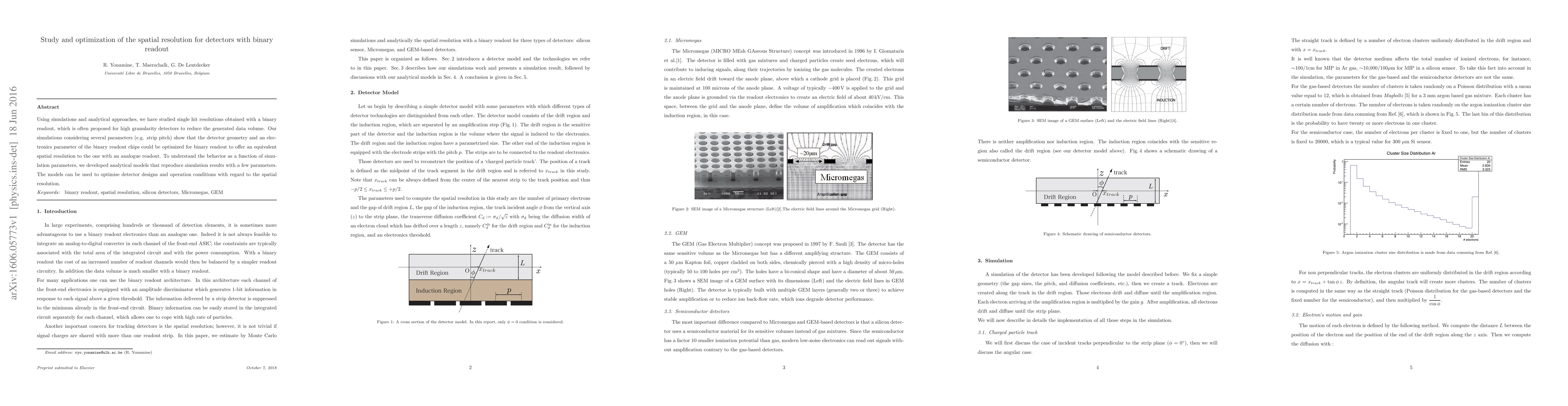 This paper explores the spatial resolution of detectors with binary readout through simulations and analytical models, demonstrating that optimizing detector geometry and electronics parameters can achieve equivalent resolution to analogue readouts. The developed analytical models facilitate the optimization of detector designs for improved spatial resolution.