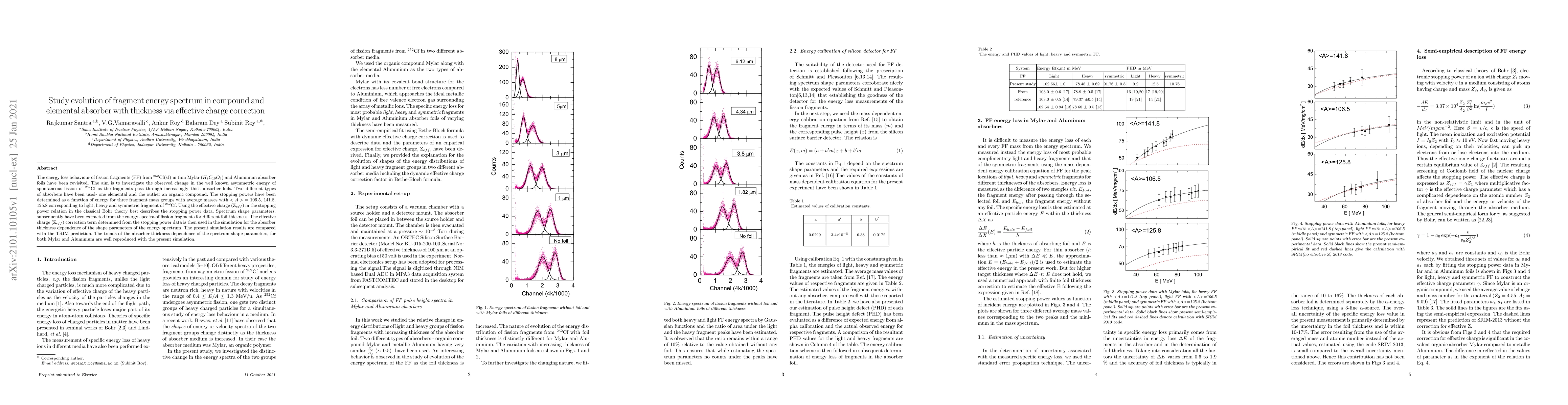 The energy loss behaviour of fission fragments (FF) from $^{252}$Cf(sf) in thin Mylar ($H_8 C_{10} O_4$) and Aluminium absorber foils have been revisited. The aim is to investigate the observed change in the well known asymmetric energy of spontaneous fission of $^{252}$Cf as the fragments pass through increasingly thick absorber foils. Two different types of absorbers have been used: one elemental and the other an organic compound. The stopping powers have been determined as a function of energy for three fragment mass groups with average masses with $$ = 106.5, 141.8, 125.8 corresponding to light, heavy and symmetric fragment of $^{252}$Cf. Using the effective charge (Z$_{eff}$) in the stopping power relation in the classical Bohr theory best describes the stopping power data. Spectrum shape parameters, subsequently have been extracted from the energy spectra of fission fragments for different foil thickness. The effective charge (Z$_{eff}$) correction term determined from the stopping power data is then used in the simulation for the absorber thickness dependence of the shape parameters of the energy spectrum. The present simulation results are compared with the TRIM prediction. The trends of the absorber thickness dependence of the spectrum shape parameters, for both Mylar and Aluminium are well reproduced with the present simulation.