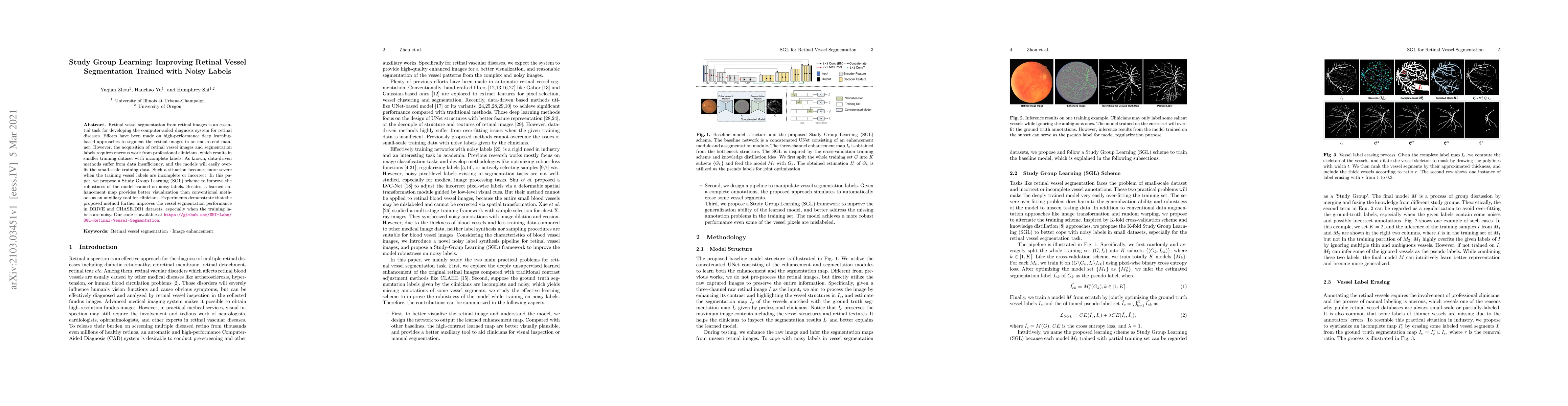 Retinal vessel segmentation from retinal images is an essential task for developing the computer-aided diagnosis system for retinal diseases. Efforts have been made on high-performance deep learning-based approaches to segment the retinal images in an end-to-end manner. However, the acquisition of retinal vessel images and segmentation labels requires onerous work from professional clinicians, which results in smaller training dataset with incomplete labels. As known, data-driven methods suffer from data insufficiency, and the models will easily over-fit the small-scale training data. Such a situation becomes more severe when the training vessel labels are incomplete or incorrect. In this paper, we propose a Study Group Learning (SGL) scheme to improve the robustness of the model trained on noisy labels. Besides, a learned enhancement map provides better visualization than conventional methods as an auxiliary tool for clinicians. Experiments demonstrate that the proposed method further improves the vessel segmentation performance in DRIVE and CHASE$\_$DB1 datasets, especially when the training labels are noisy.