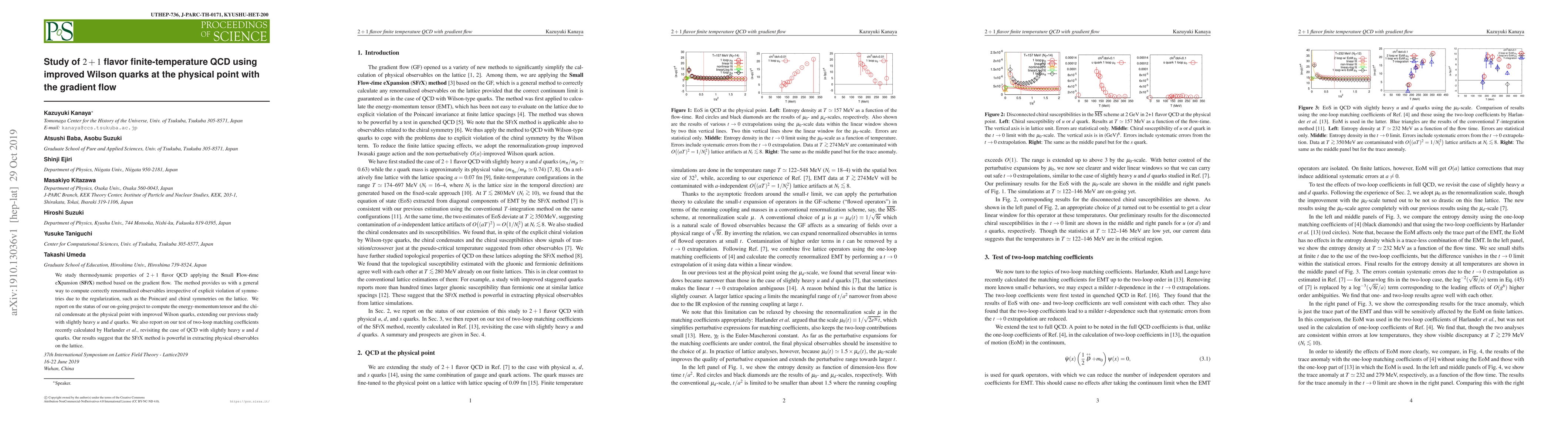 We study thermodynamic properties of 2+1 flavor QCD applying the Small Flow-time eXpansion (SFtX) method based on the gradient flow. The method provides us with a general way to compute correctly renormalized observables irrespective of explicit violation of symmetries due to the regularization, such as the Poincare and chiral symmetries on the lattice. We report on the status of our on-going project to compute the energy-momentum tensor and the chiral condensate at the physical point with improved Wilson quarks, extending our previous study with slightly heavy u and d quarks. We also report on our test of two-loop matching coefficients recently calculated by Harlander et al., revisiting the case of QCD with slightly heavy u and d quarks. Our results suggest that the SFtX method is powerful in extracting physical observables on the lattice.