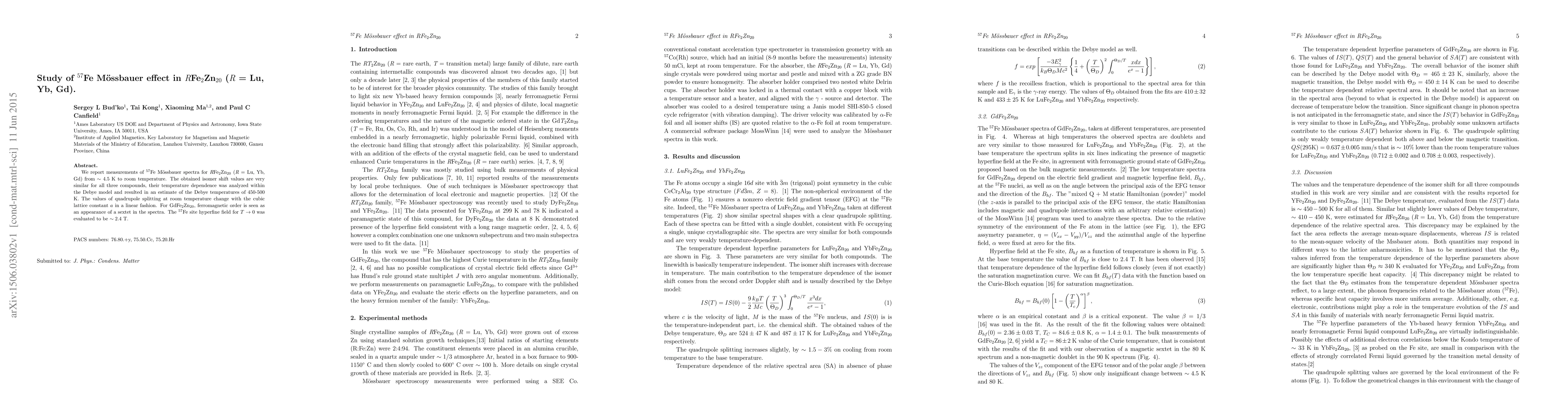 This study investigates the 57Fe Mossbauer spectra of RFe2Zn20 (R = Lu, Yb, Gd) from 4.5 K to room temperature, revealing similar isomer shifts and Debye temperatures of 450-500 K. GdFe2Zn20 exhibits ferromagnetic order, with a hyperfine field of ~2.4 T at 0 K.