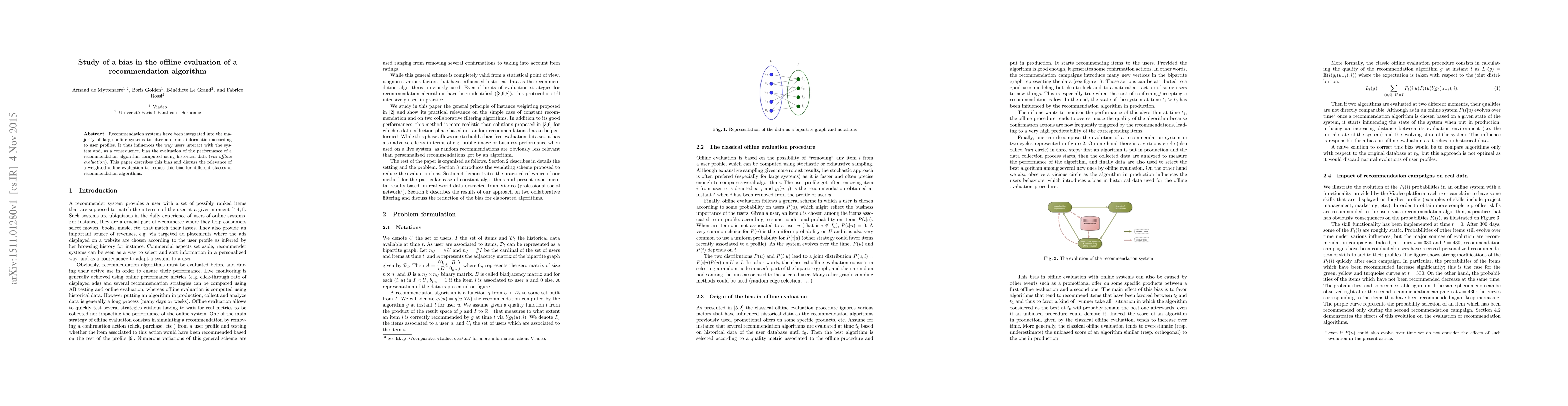 Recommendation systems have been integrated into the majority of large online systems to filter and rank information according to user profiles. It thus influences the way users interact with the system and, as a consequence, bias the evaluation of the performance of a recommendation algorithm computed using historical data (via offline evaluation). This paper describes this bias and discuss the relevance of a weighted offline evaluation to reduce this bias for different classes of recommendation algorithms.