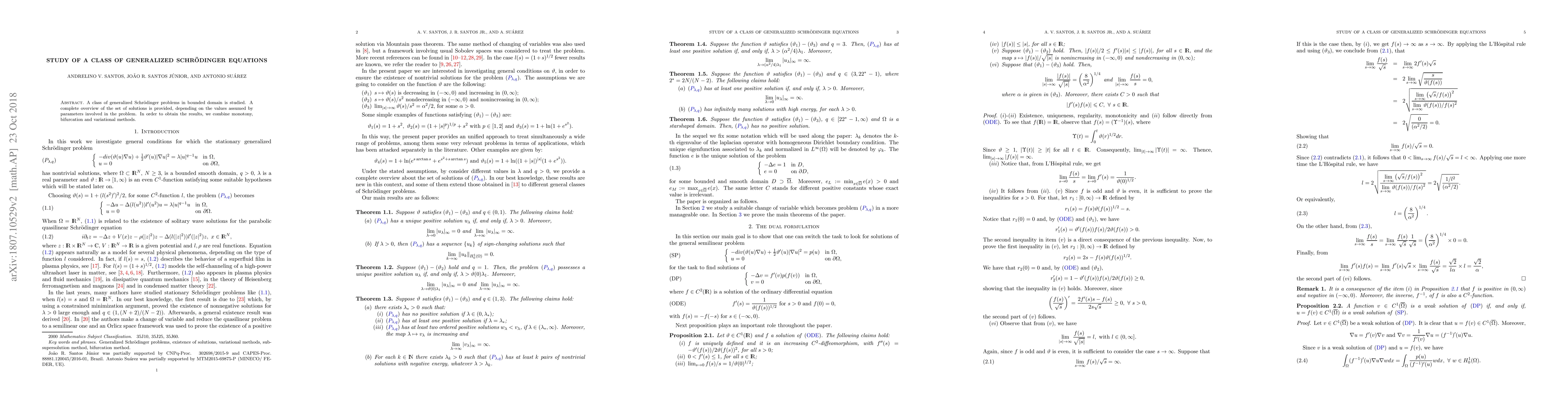 A class of generalized Schr\"{o}dinger problems in bounded domain is studied. A complete overview of the set of solutions is provided, depending on the values assumed by parameters involved in the problem. In order to obtain the results, we combine monotony, bifurcation and variational methods.