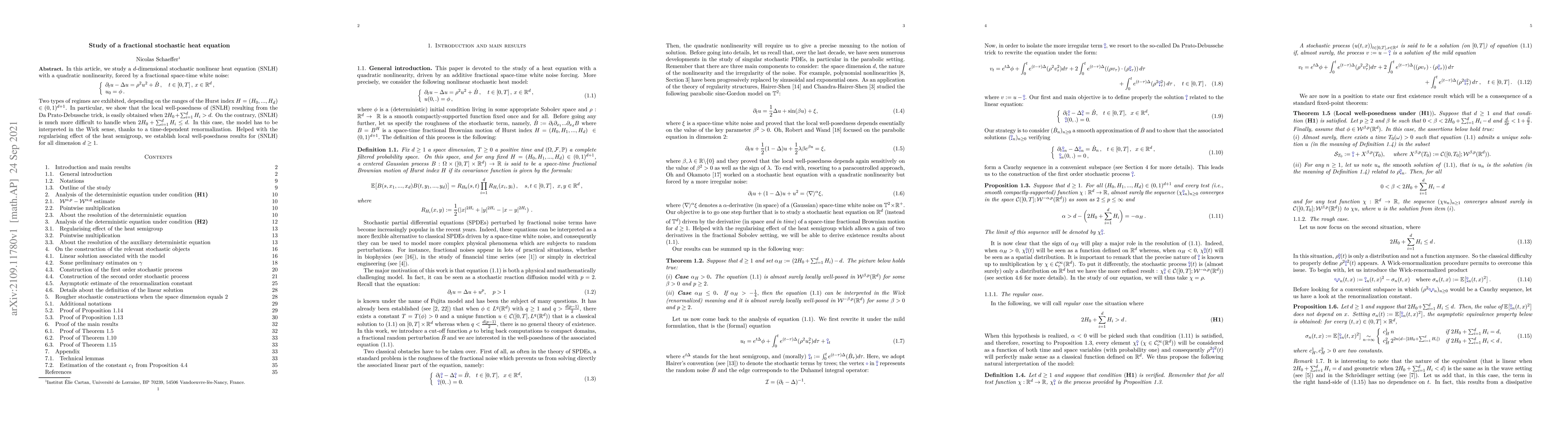 In this article, we study a $d$-dimensional stochastic nonlinear heat equation (SNLH) with a quadratic nonlinearity, forced by a fractional space-time white noise: \begin{equation*} \left\{\begin{array}{l} \partial_t u-\Delta u= \rho^2 u^2 + \dot B \, , \quad t\in [0,T] \, , \, x\in \mathbb{R}^d \, ,\\ u_0=\phi\, . \end{array} \right. \end{equation*} Two types of regimes are exhibited, depending on the ranges of the Hurst index $H=(H_0,...,H_d)$ $\in (0,1)^{d+1}$. In particular, we show that the local well-posedness of (SNLH) resulting from the Da Prato-Debussche trick, is easily obtained when $2 H_0+\sum_{i=1}^{d}H_i >d$. On the contrary, (SNLH) is much more difficult to handle when $2H_0+\sum_{i=1}^{d}H_i \leq d$. In this case, the model has to be interpreted in the Wick sense, thanks to a time-dependent renormalization. Helped with the regularising effect of the heat semigroup, we establish local well-posedness results for (SNLH) for all dimension $d\geq1.$