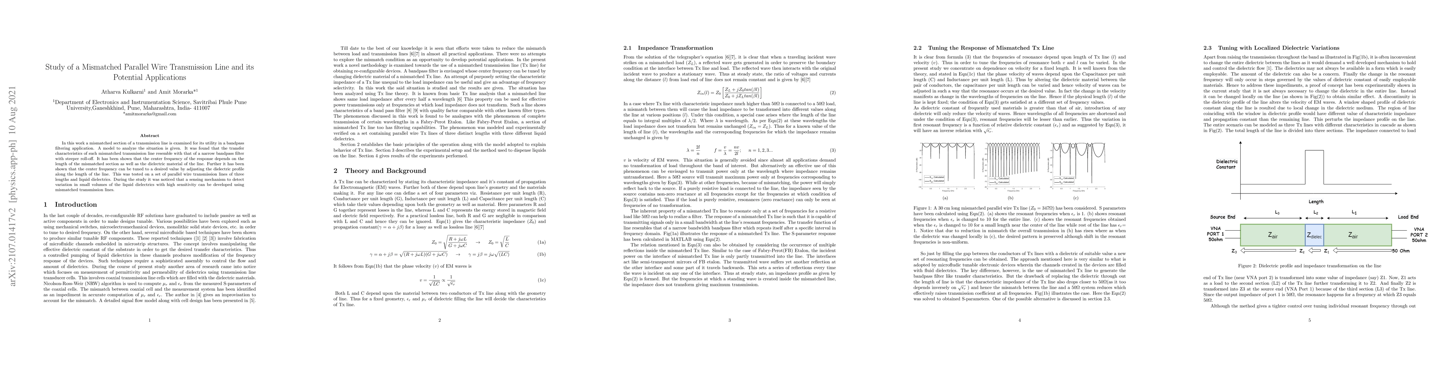 In this work a mismatched section of a transmission line is examined for its utility in a bandpass filtering application. A model to analyze the situation is given. It was found that the transfer characteristics of such mismatched transmission line resemble with that of a narrow bandpass filter with steeper roll-off. It has been shown that the center frequency of the response depends on the length of the mismatched section as well as the dielectric material of the line. Further it has been shown that the center frequency can be tuned to a desired value by adjusting the dielectric profile along the length of the line. This was tested on a set of parallel wire transmission lines of three lengths and liquid dielectrics. During the study it was noticed that a sensing mechanism to detect variation in small volumes of the liquid dielectrics with high sensitivity can be developed using mismatched transmission lines.