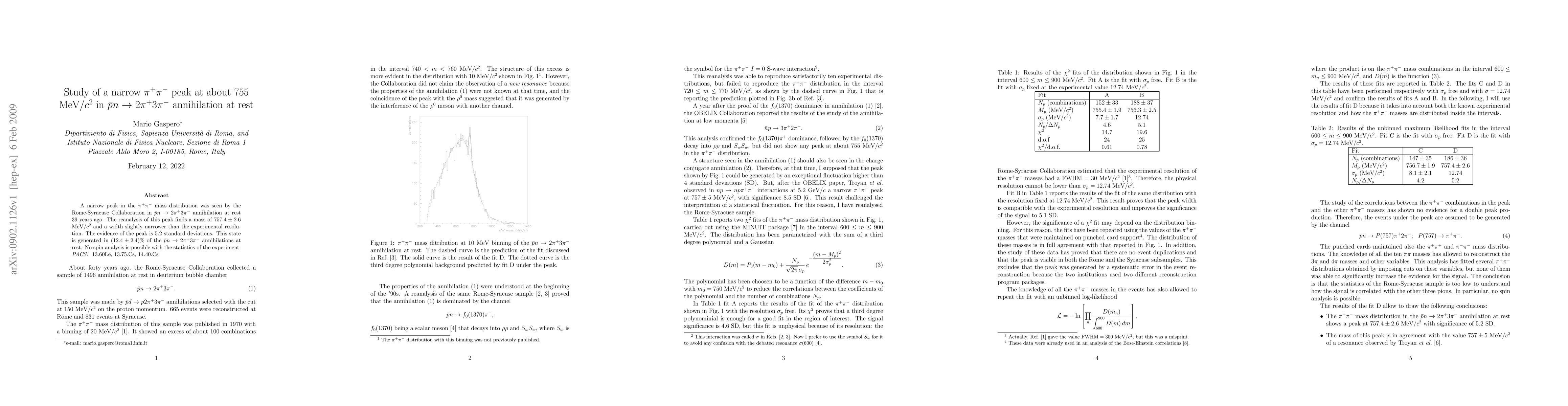 The Rome-Syracuse Collaboration reanalyzed a narrow pi+ pi- peak at 757.4 MeV/c^2 in bar-p n --> 2 pi+ 3 pi- annihilations, finding it to be slightly narrower than the experimental resolution with a significance of 5.2 standard deviations. This state occurs in 12.4% of such annihilations, but spin analysis is not feasible due to limited statistics.