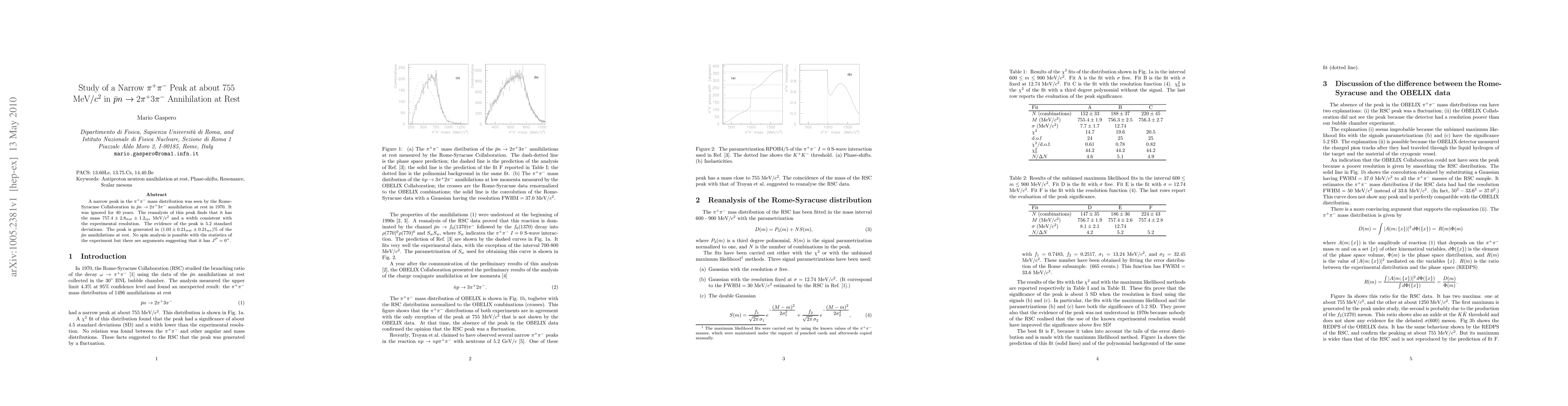 Researchers reanalyzed a 1970 experiment finding a narrow peak in pi+ pi- mass distribution with a mass of 757.4 MeV/c^2 and evidence of 5.2 standard deviations.