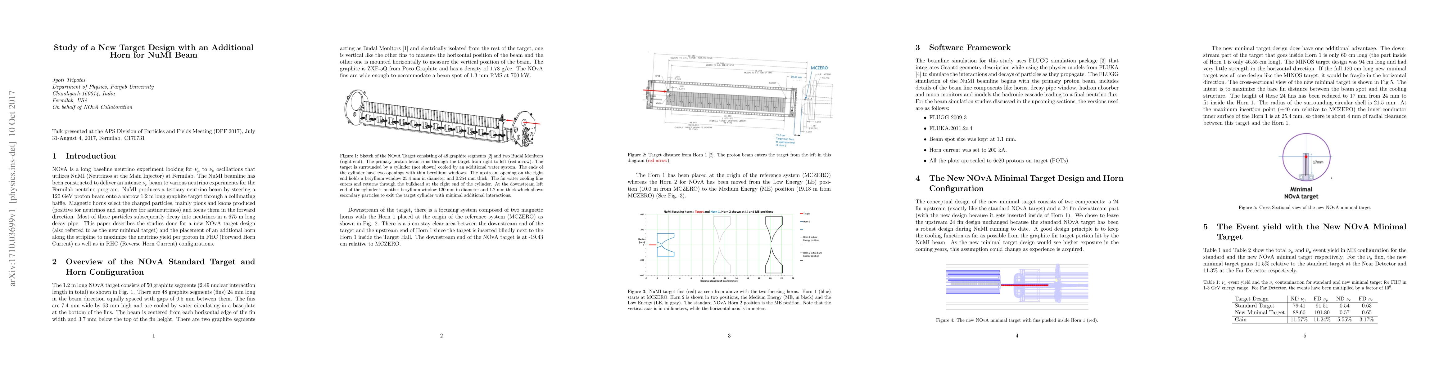 This paper describes the simulation studies done for the standard NOvA target and the proposed new minimal NOvA target design, in forward and reverse horn current for studying the neutrino and antineutrino event yield and the background contamination at the near and far detector. The standard NOvA target is segmented into 48 graphite segments (fins) with two magnetic horns, Horn 1 placed at MCZERO and Horn 2 placed at 19.18 m from MCZERO. The new minimal target design has 24 graphite fins extended into Horn 1. It shows the study for the position optimization of the Horn 2 relative to Horn 1 for the standard and the new minimal target design. The effect of introducing an additional horn (identical to Horn 2) with the new minimal target design, on the neutrino yield and the energy spectra, has also been explored.