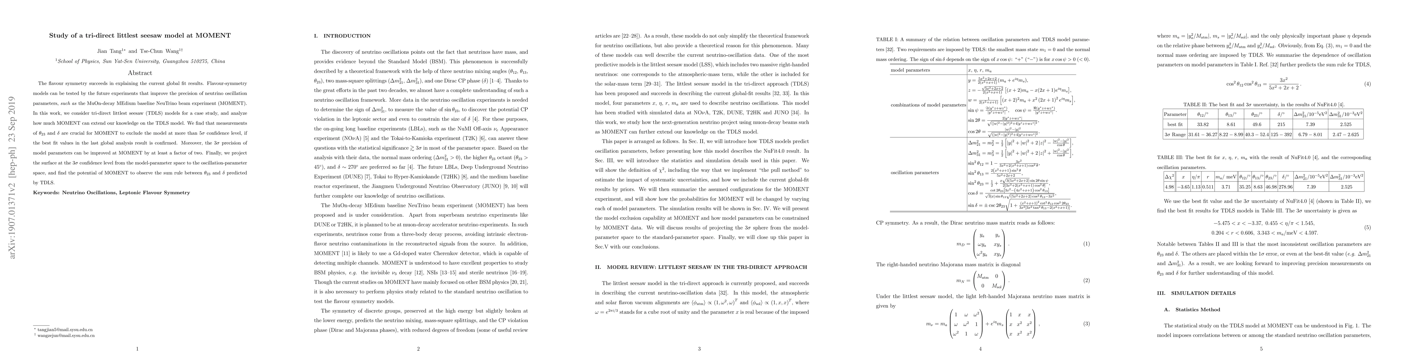 The flavour symmetry succeeds in explaining the current global fit results. Flavour-symmetry models can be tested by the future experiments that improve the precision of neutrino oscillation parameters, \textit{such as} the MuOn-decay MEdium baseline NeuTrino beam experiment (MOMENT). In this work, we consider tri-direct littlest seesaw (TDLS) models for a case study, and analyze how much MOMENT can extend our knowledge on the TDLS model. We find that measurements of $\theta_{23}$ and $\delta$ are crucial for MOMENT to exclude the model at more than $5\sigma$ confidence level, if the best fit values in the last global analysis result is confirmed. Moreover, the $3\sigma$ precision of model parameters can be improved at MOMENT by at least a factor of two. Finally, we project the surface at the $3\sigma$ confidence level from the model-parameter space to the oscillation-parameter space, and find the potential of MOMENT to observe the sum rule between $\theta_{23}$ and $\delta$ predicted by TDLS.