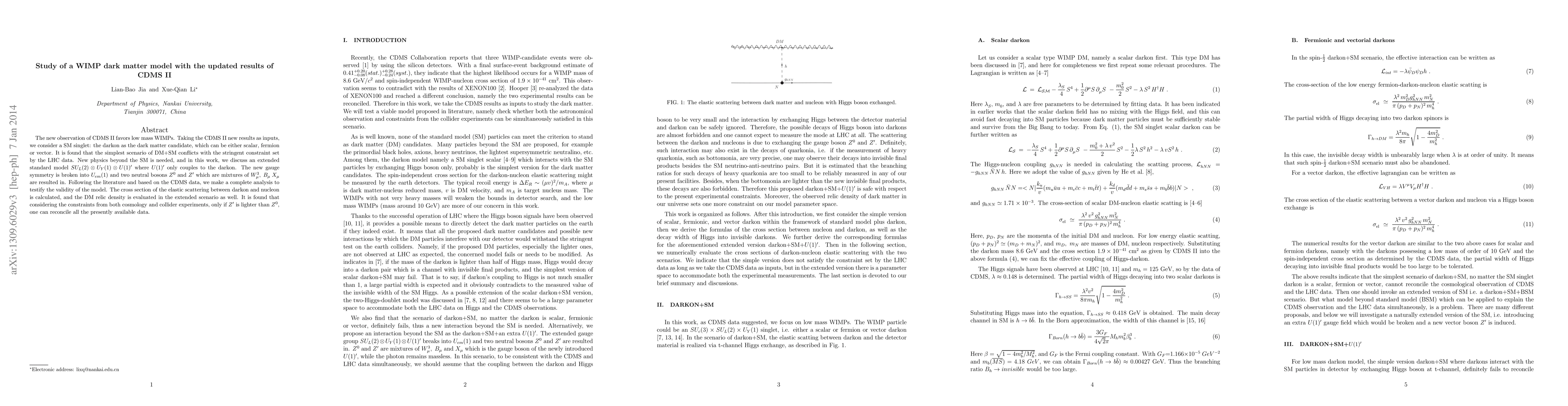 The new observation of CDMS II favors low mass WIMPs. Taking the CDMS II new results as inputs, we consider a SM singlet: the darkon as the dark matter candidate, which can be either scalar, fermion or vector. It is found that the simplest scenario of DM+SM conflicts with the stringent constraint set by the LHC data. New physics beyond the SM is needed, and in this work, we discuss an extended standard model $SU_L(2)\otimes U_Y(1)\otimes U(1)'$ where $U(1)'$ only couples to the darkon. The new gauge symmetry is broken into $U_{em}(1)$ and two neutral bosons $Z^0$ and $Z'$ which are mixtures of $W^3_{\mu},\; B_{\mu}\; X_{\mu}$ are resulted in. Following the literature and based on the CDMS data, we make a complete analysis to testify the validity of the model. The cross section of the elastic scattering between darkon and nucleon is calculated, and the DM relic density is evaluated in the extended scenario as well. It is found that considering the constraints from both cosmology and collider experiments, only if $Z'$ is lighter than $Z^0$, one can reconcile all the presently available data.