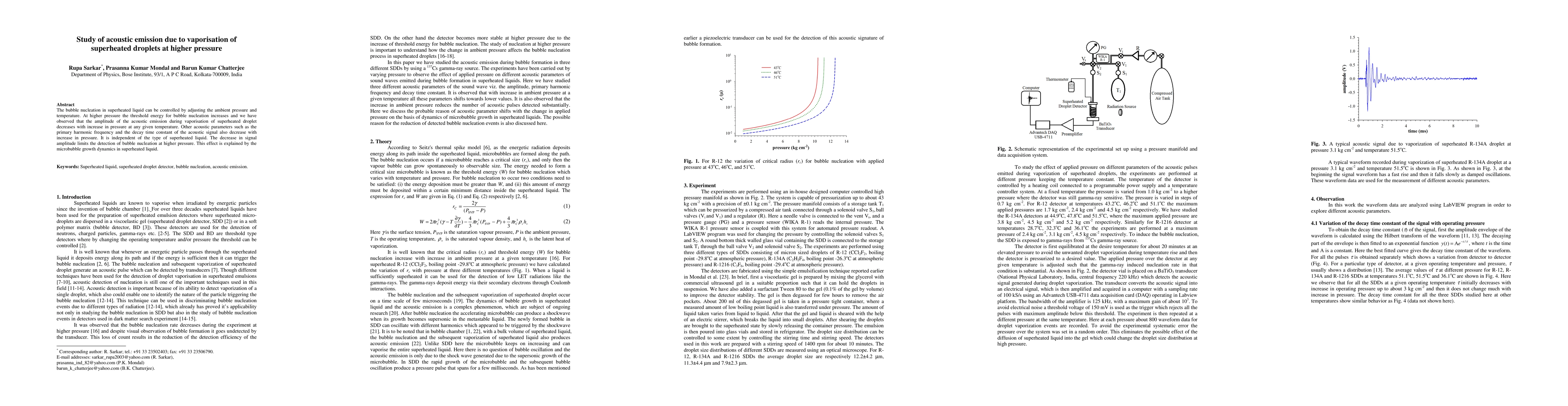 The bubble nucleation in superheated liquid can be controlled by adjusting the ambient pressure and temperature. At higher pressure the threshold energy for bubble nucleation increases and we have observed that the amplitude of the acoustic emission during vaporisation of superheated droplet decreases with increase in pressure at any given temperature. Other acoustic parameters such as the primary harmonic frequency and the decay time constant of the acoustic signal also decrease with increase in pressure. It is independent of the type of superheated liquid. The decrease in signal amplitude limits the detection of bubble nucleation at higher pressure. This effect is explained by the microbubble growth dynamics in superheated liquid.