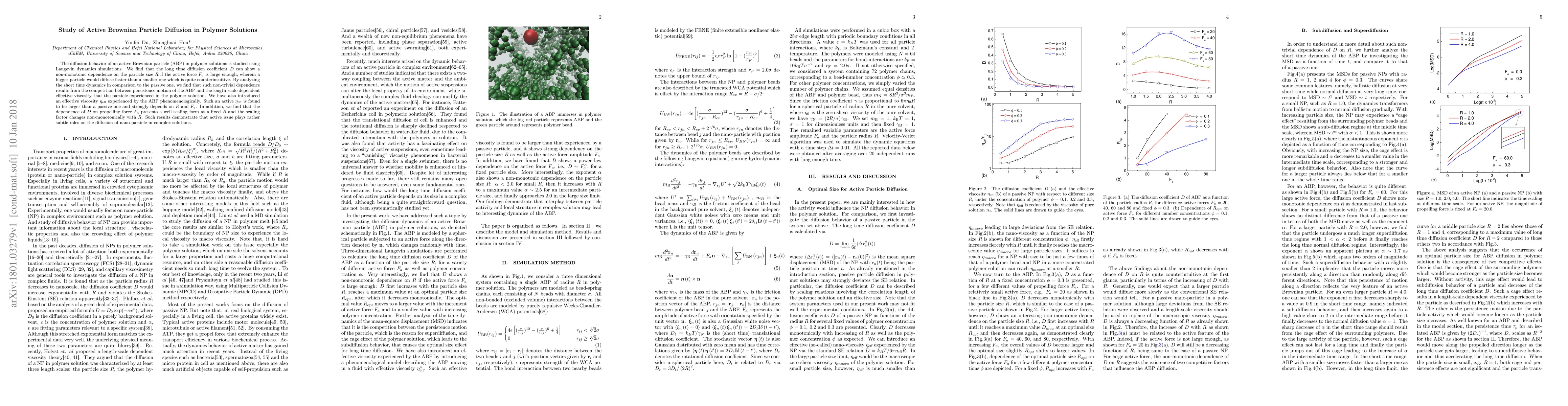 This study investigates the diffusion behavior of active Brownian particles in polymer solutions using Langevin dynamics simulations. It reveals a non-monotonic relationship between the diffusion coefficient and particle size, where larger particles can diffuse faster than smaller ones due to competition between persistence motion and effective viscosity. The effective viscosity experienced by the active particles is significantly larger than that for passive particles and varies with particle size and active force.