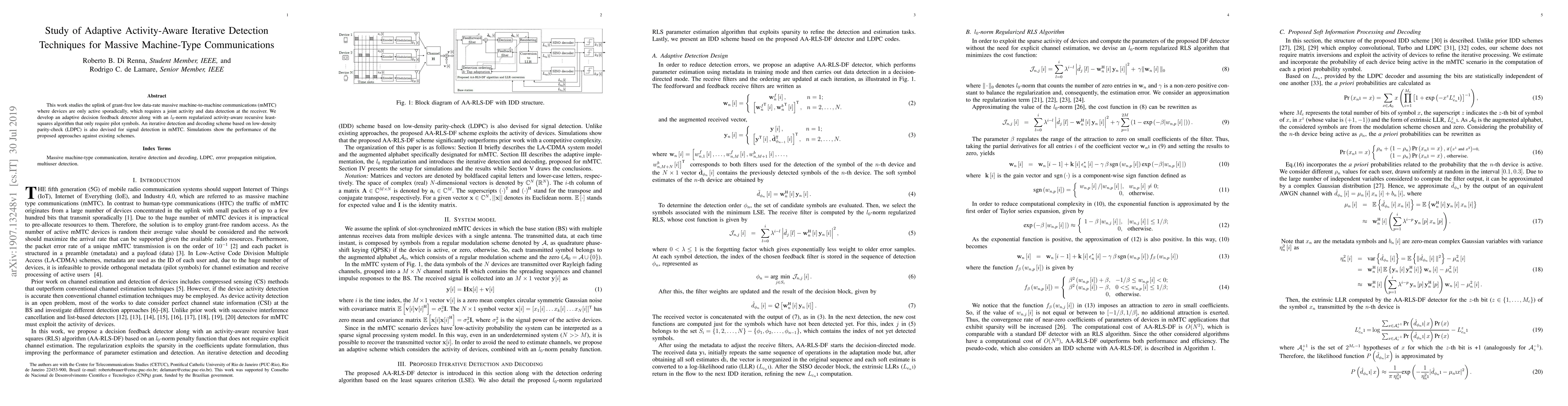 This work studies the uplink of grant-free low data-rate massive machine-to-machine communications (mMTC) where devices are only active sporadically, which requires a joint activity and data detection at the receiver. We develop an adaptive decision feedback detector along with an $l_0$-norm regularized activity-aware recursive least-squares algorithm that only require pilot symbols. An iterative detection and decoding scheme based on low-density parity-check (LDPC) is also devised for signal detection in mMTC. Simulations show the performance of the proposed approaches against existing schemes.