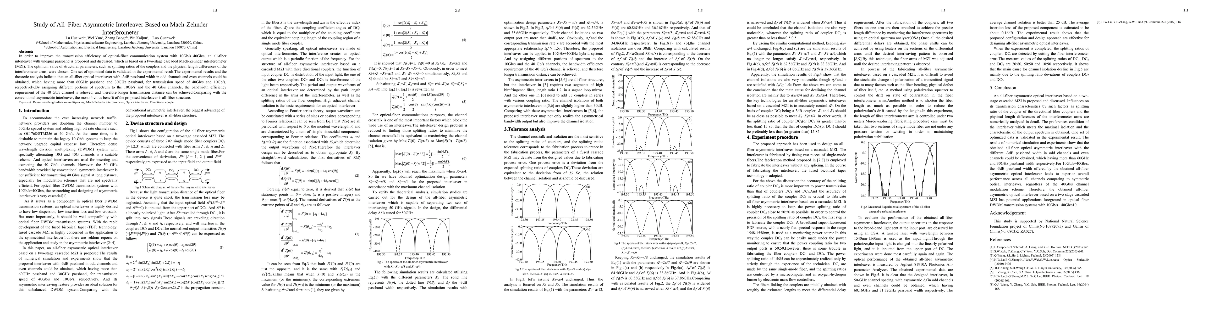 This paper proposes an all-fiber asymmetric interleaver based on a two-stage Mach-Zehnder interferometer to enhance optical-fiber communication efficiency for 10Gb/s and 40Gb/s transmission speeds, achieving optimized bandwidths and longer transmission distances. Experimental results validate the design, showing distinct passbands for different channels.
