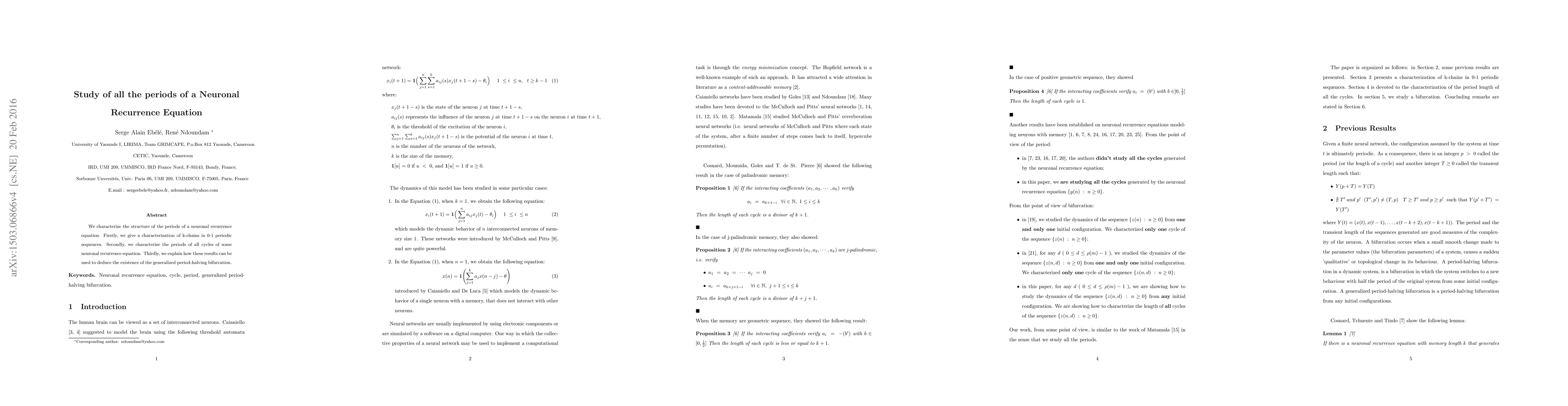 We characterize the structure of the periods of a neuronal recurrence equation. Firstly, we give a characterization of k-chains in 0-1 periodic sequences. Secondly, we characterize the periods of all cycles of some neuronal recurrence equation. Thirdly, we explain how these results can be used to deduce the existence of the generalized period-halving bifurcation.