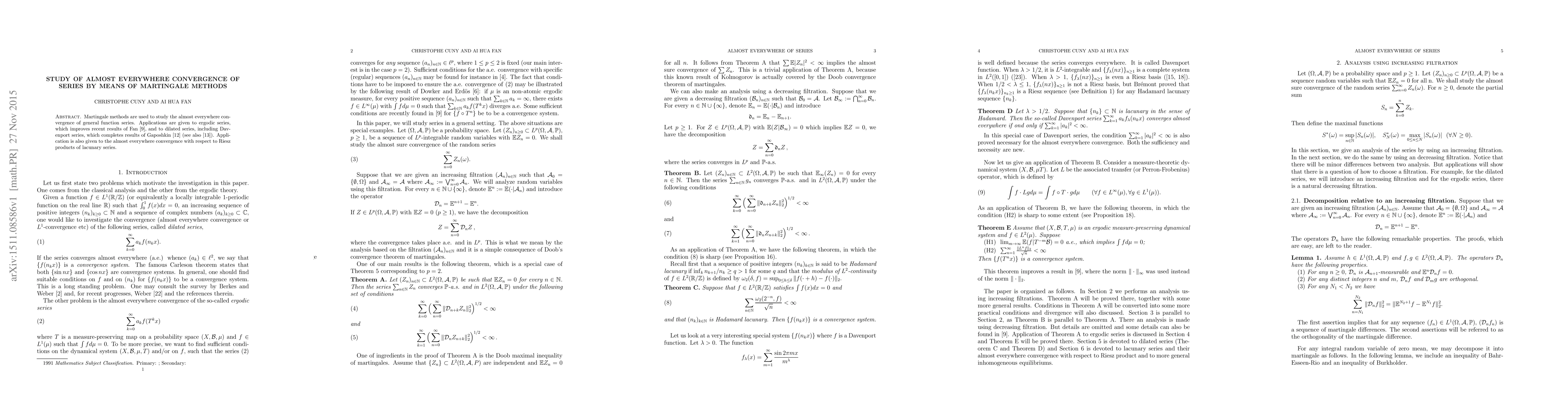 This paper employs martingale methods to investigate the almost everywhere convergence of various function series, including ergodic and dilated series, and lacunary series with respect to Riesz products, improving and completing prior results by Fan and Gaposhkin.