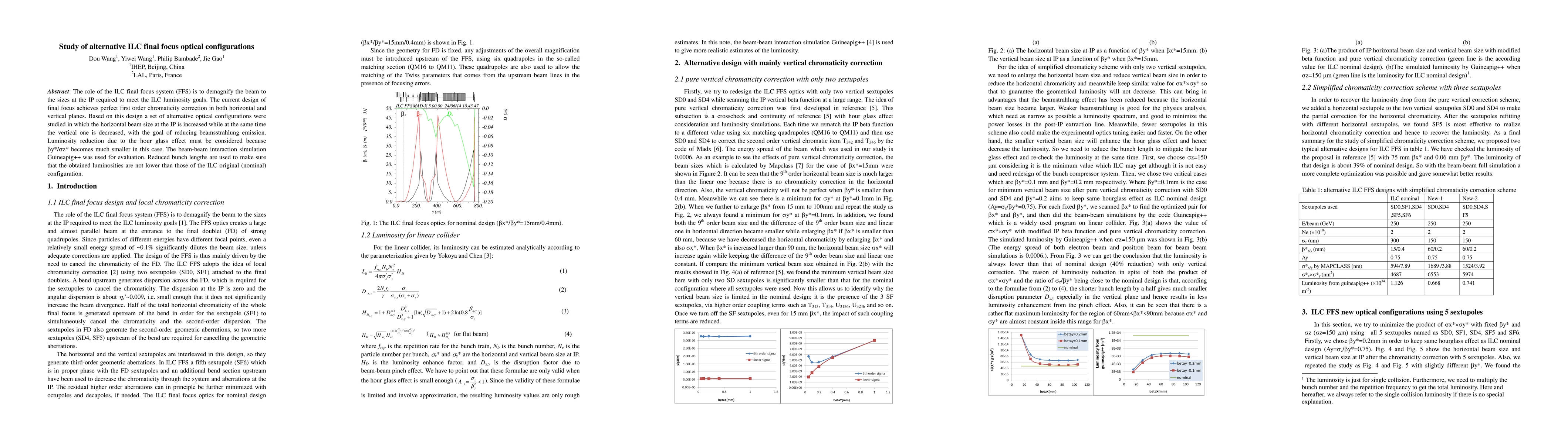 The role of the ILC final focus system (FFS) is to demagnify the beam to the sizes at the IP required to meet the ILC luminosity goals. The current design of final focus performs perfect chromaticity correction in both horizontal and vertical planes. Based on this design a set of alternative optical configurations were studied in which the horizontal beam size at the IP is increased while at the same time the vertical one is decreased, with the goal of reducing beamsstrahlung emission. Luminosity reduction due to the hour glass effect must be considered because betay*/sigmaz* becomes much smaller in this case. The beam-beam interaction simulation by Guineapig++ was used for evaluation. Reduced bunch lengths are used to make sure that the obtained luminosities are not lower than those of the ILC original (nominal) configuration.