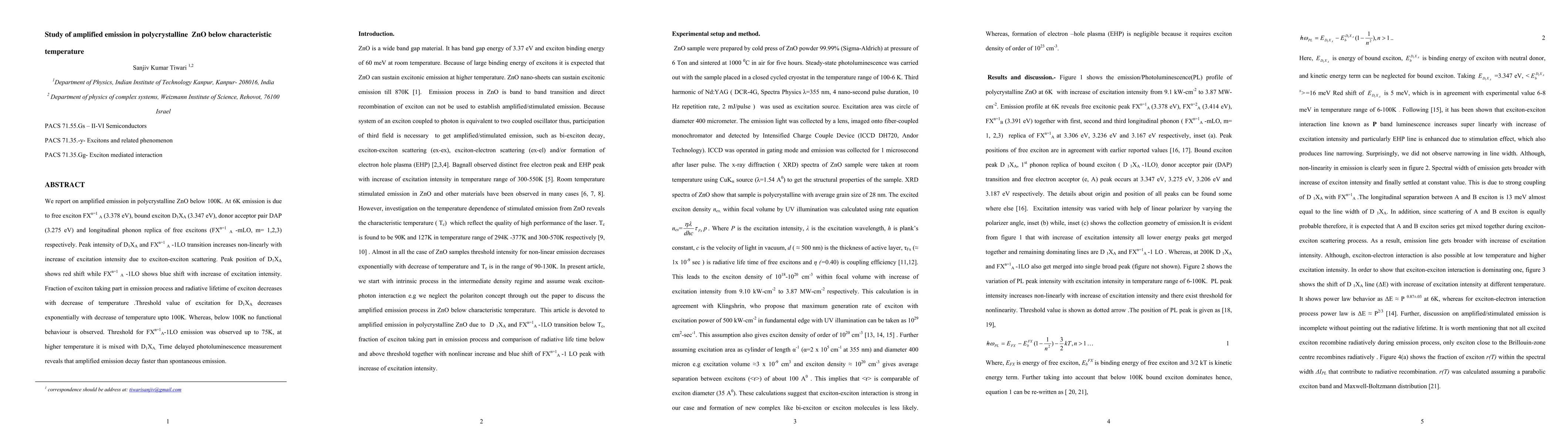 This study investigates amplified emission in polycrystalline ZnO at temperatures below 100K, identifying contributions from free excitons, bound excitons, and donor-acceptor pairs. The emission intensity and peak shifts vary with excitation intensity, showing complex behaviors below 100K, while above this temperature, no distinct functional behavior is observed.