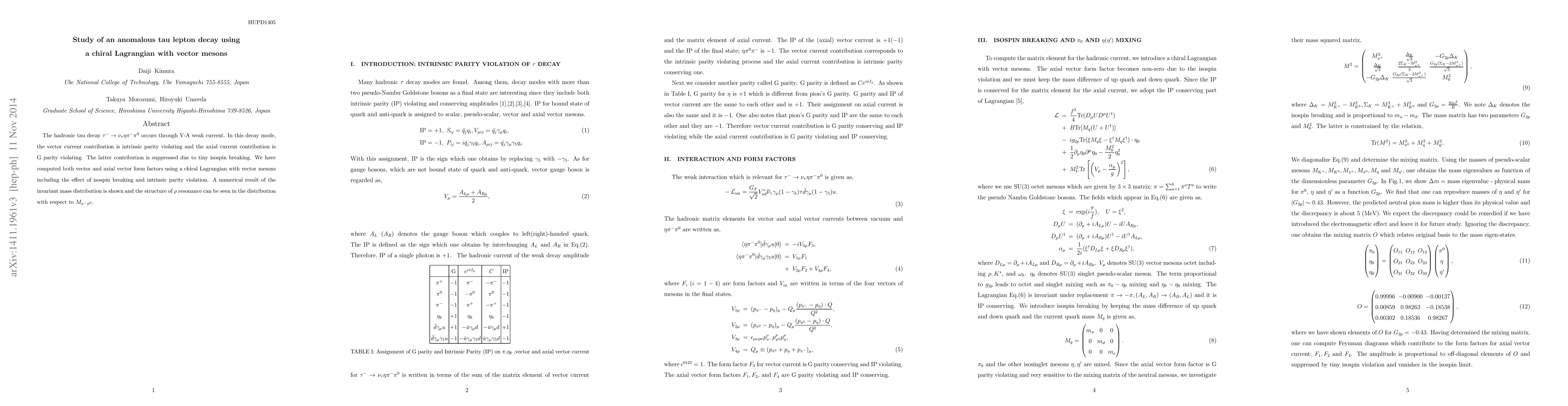 This study investigates the anomalous decay of a tau lepton into a neutrino, an eta meson, and two pions using a chiral Lagrangian with vector mesons. The analysis reveals intrinsic parity violation in the vector current and G parity violation in the axial current, with the latter suppressed due to small isospin breaking.