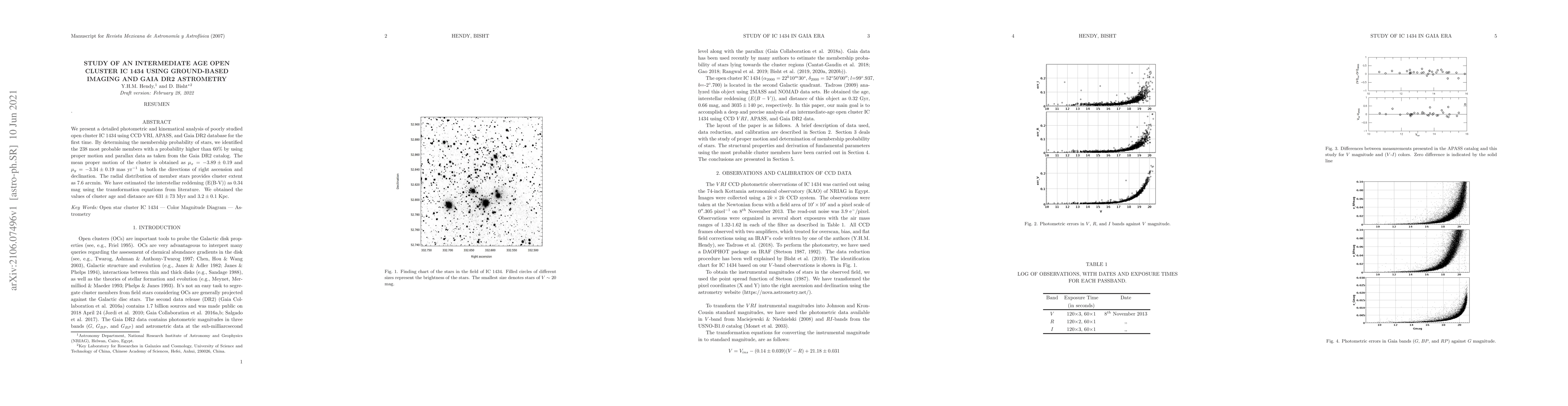 This study provides a detailed photometric and kinematical analysis of the open cluster IC 1434 using CCD VRI, APASS, and Gaia DR2 data. The analysis identifies 238 probable members, estimates the cluster's age at 631 ± 73 Myr, and determines a distance of 3.2 ± 0.1 kpc.