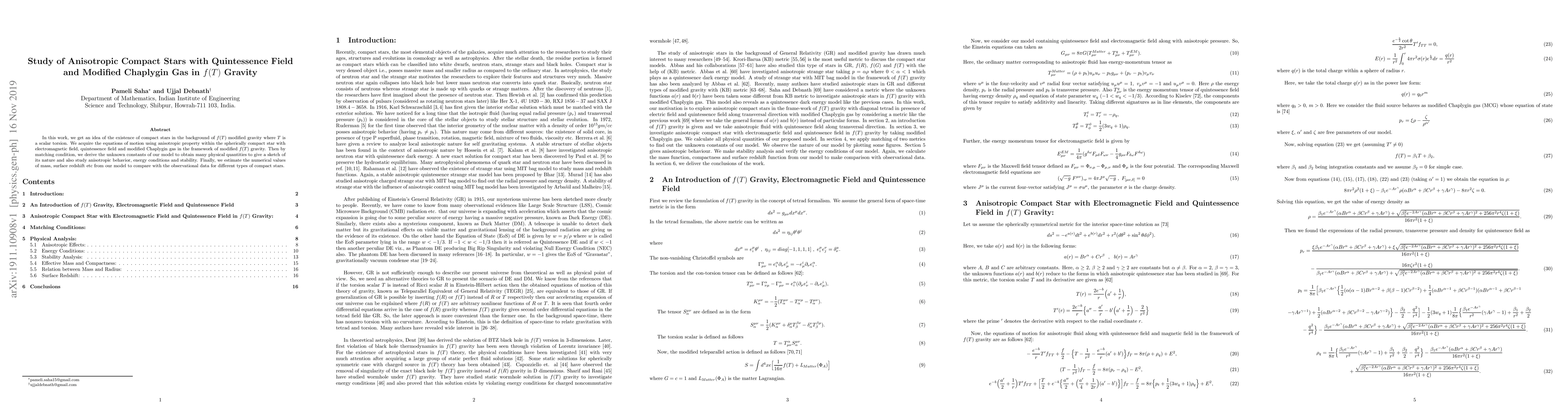 This paper explores the existence of anisotropic compact stars in the context of f(T) modified gravity, incorporating quintessence fields and modified Chaplygin gas. It derives equations of motion and matches conditions to determine physical quantities, studying their anisotropic behavior, energy conditions, and stability, and compares numerical values with observational data.