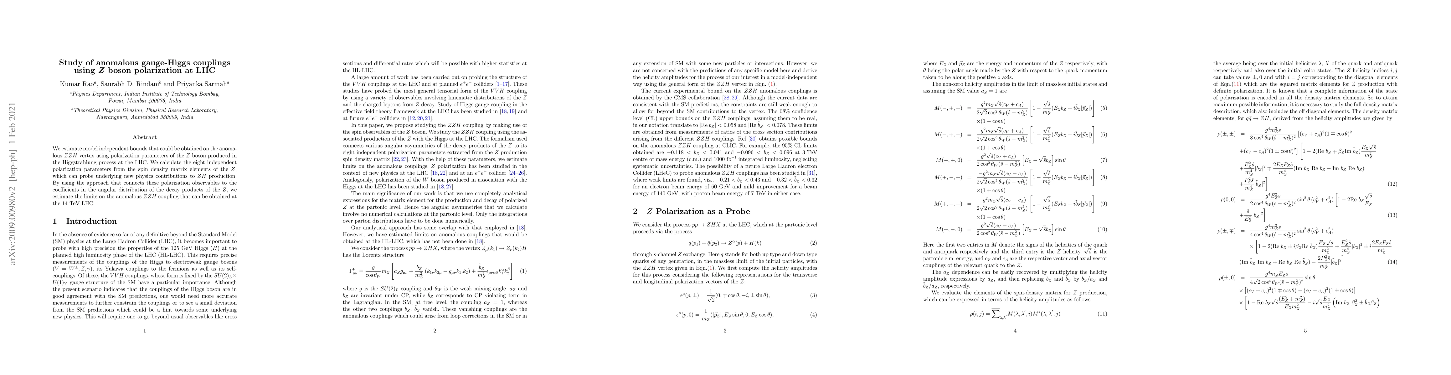 Researchers estimate bounds on anomalous Z boson-Higgs coupling using LHC polarization parameters to detect potential new physics effects in Higgstrahlung production.