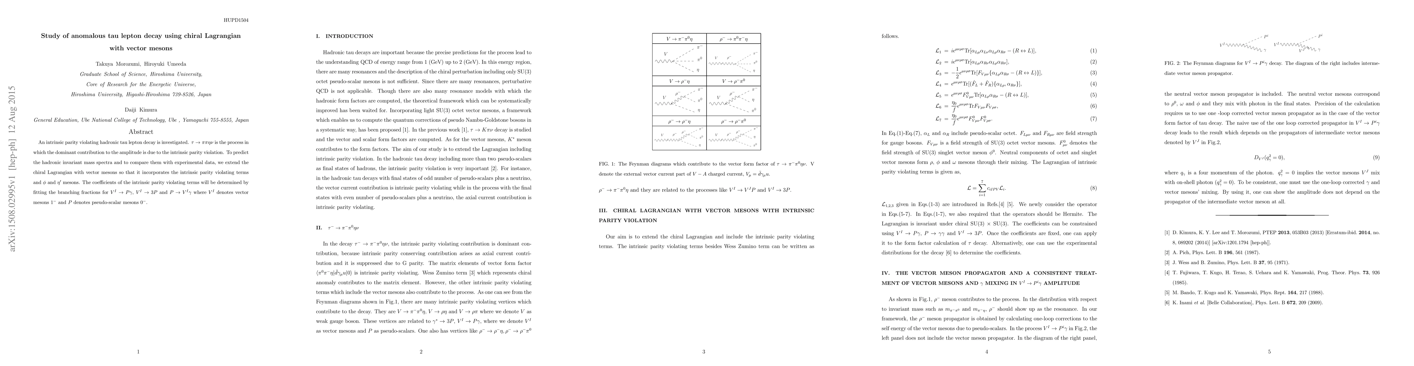 An intrinsic parity violating hadronic tau lepton decay is investigated. $\tau \to \pi \pi \eta \nu$ is the process in which the dominant contribution to the amplitude is due to the intrinsic parity violation. To predict the hadronic invariant mass spectra and to compare them with experimental data, we extend the chiral Lagrangian with vector mesons so that it incorporates the intrinsic parity violating terms and $\phi$ and $\eta^\prime$ mesons. The coefficients of the intrinsic parity violating terms will be determined by fitting the branching fractions for $V^I \rightarrow P \gamma$, $V^I \rightarrow 3 P$ and $P \to V^I \gamma $ where $V^I$ denotes vector mesons $1^-$ and $P$ denotes pseudo-scalar mesons $0^-$.