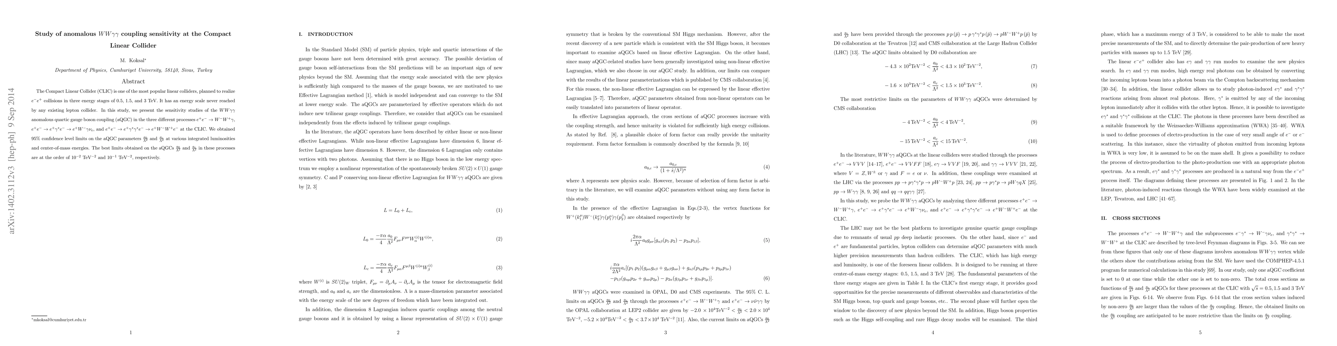 This study investigates the sensitivity of the Compact Linear Collider (CLIC) to anomalous quartic gauge boson couplings in $WW\gamma\gamma$ interactions at various energies. The best limits achieved on the anomalous coupling parameters are at the order of $10^{-2}$ TeV$^{-2}$ and $10^{-1}$ TeV$^{-2}$.