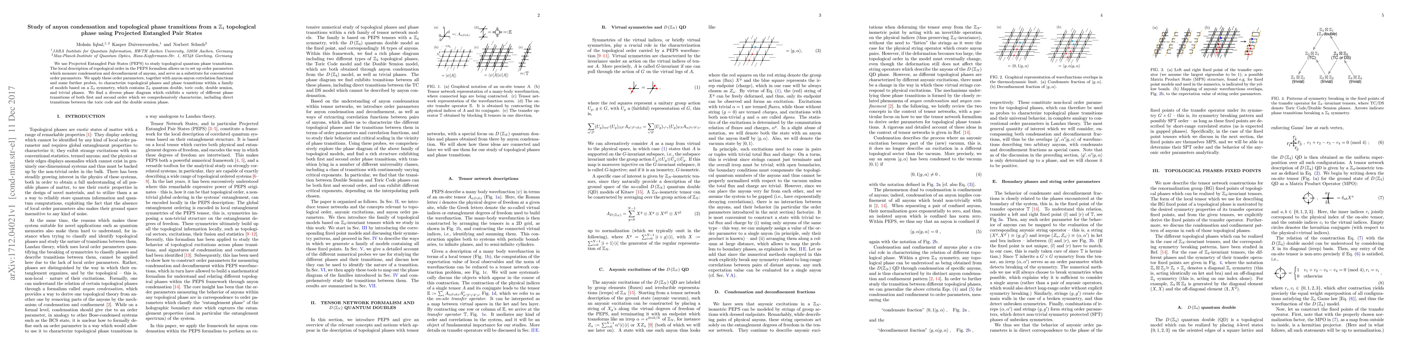 This paper uses Projected Entangled Pair States (PEPS) to investigate topological phase transitions in systems with $\mathbb{Z}_4$ symmetry, identifying diverse phase transitions through order parameters that measure anyon condensation and deconfinement. The study characterizes a variety of first and second-order transitions, including direct transitions between the toric code and double semion phases.