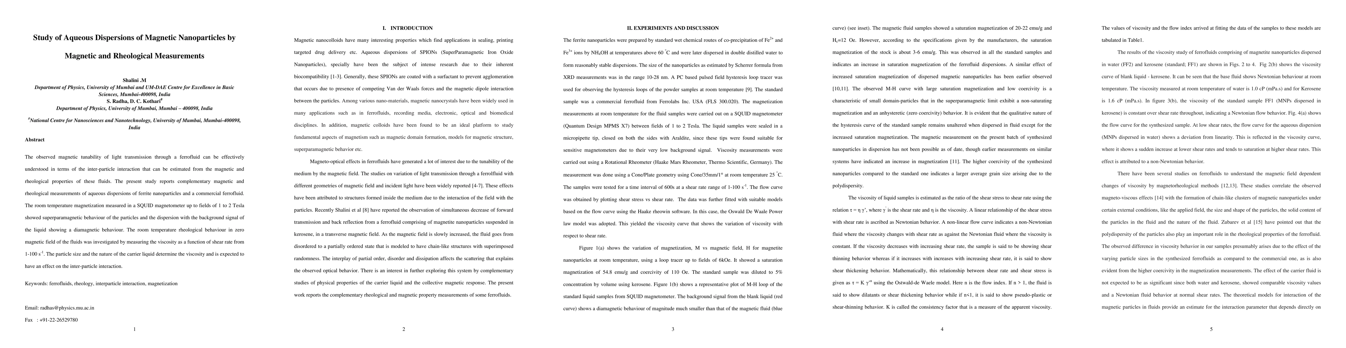 The observed magnetic tunability of light transmission through a ferrofluid can be effectively understood in terms of the inter-particle interaction that can be estimated from the magnetic and rheological properties of these fluids. The present study reports complementary magnetic and rheological measurements of aqueous dispersions of ferrite nanoparticles and a commercial ferrofluid. The room temperature magnetization measured in a SQUID magnetometer up to fields of 1 to 2 Tesla showed superparamagnetic behaviour of the particles and the dispersion with the background signal of the liquid showing a diamagnetic behaviour. The room temperature rheological behaviour in zero magnetic field of the fluids was investigated by measuring the viscosity as a function of shear rate from 1-100 s-1. The particle size and the nature of the carrier liquid determine the viscosity and is expected to have an effect on the inter-particle interaction.