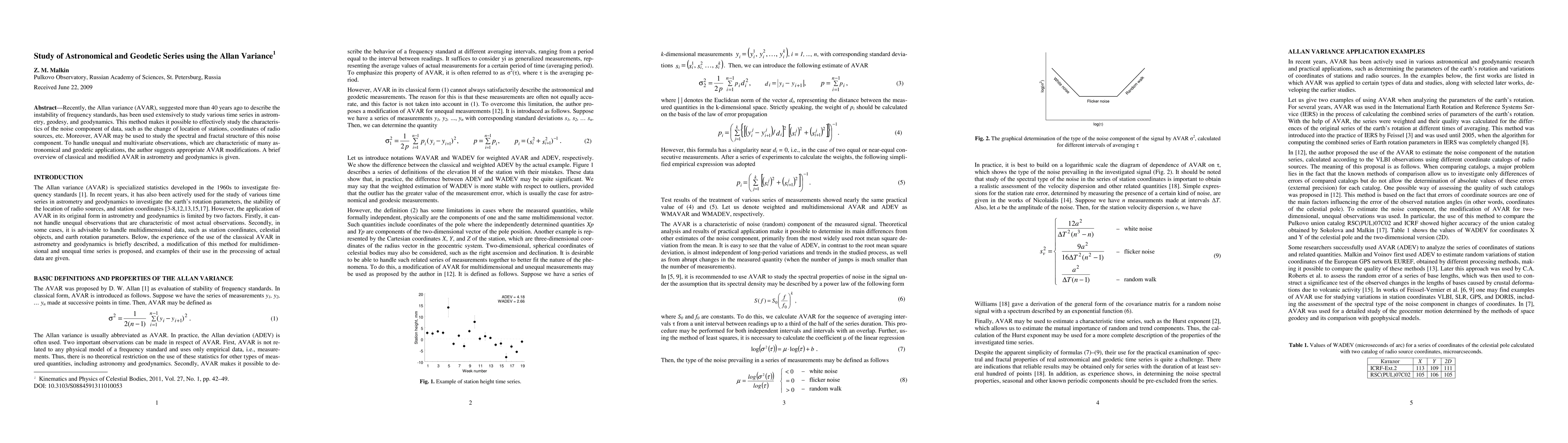This paper reviews the application of Allan variance (AVAR) for analyzing time series in astronomy and geodesy, highlighting its utility in assessing noise characteristics and exploring spectral and fractal structures. The author proposes modifications to AVAR to handle unevenly weighted and multidimensional data typical in these fields.