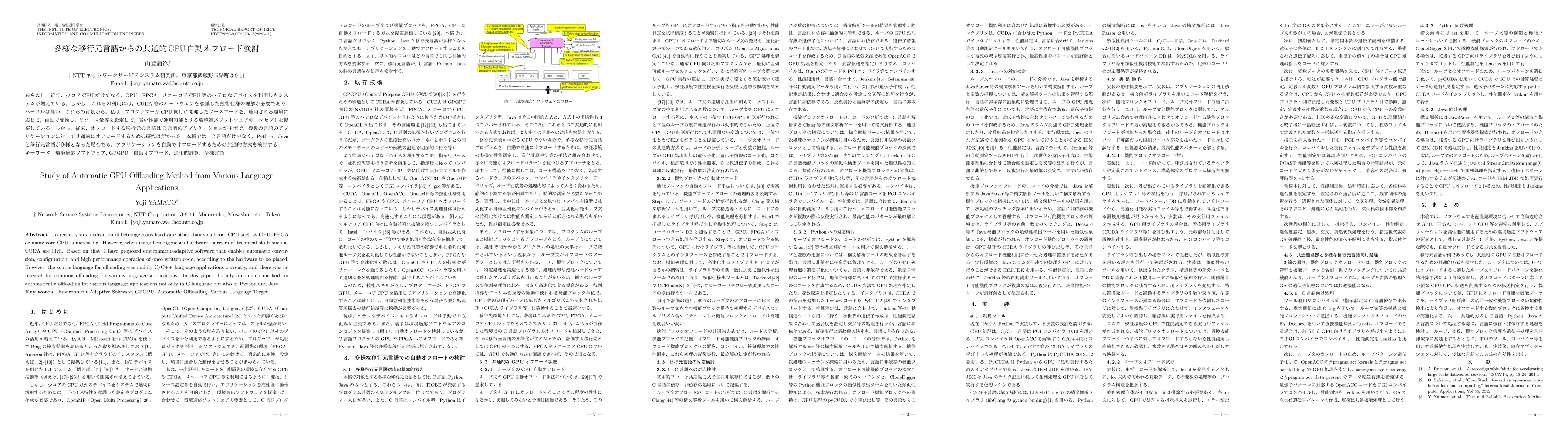 In recent years, utilization of heterogeneous hardware other than small core CPU such as GPU, FPGA or many core CPU is increasing. However, when using heterogeneous hardware, barriers of technical skills such as CUDA are high. Based on that, I have proposed environment-adaptive software that enables automatic conversion, configuration, and high performance operation of once written code, according to the hardware to be placed. However, the source language for offloading was mainly C/C++ language applications currently, and there was no research for common offloading for various language applications. In this paper, I study a common method for automatically offloading for various language applications not only in C language but also in Python and Java.