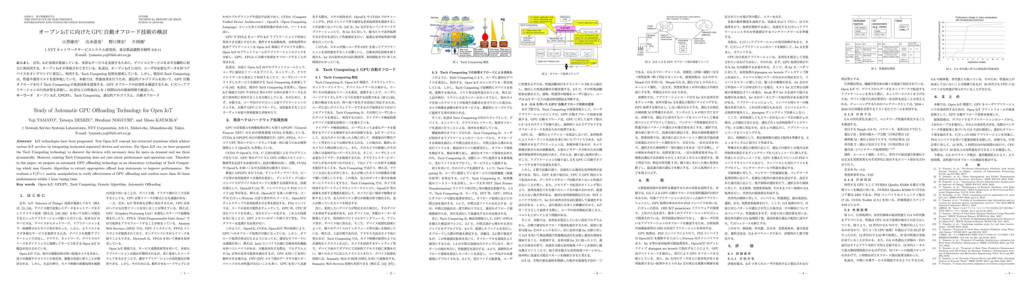 This paper proposes an automatic GPU offloading technology for Tacit Computing in Open IoT to enhance performance and reduce operation costs. Using a Genetic Algorithm, it identifies optimal offload loop statements for C/C++ matrix manipulation, achieving over 35 times performance improvement with an hour of tuning.