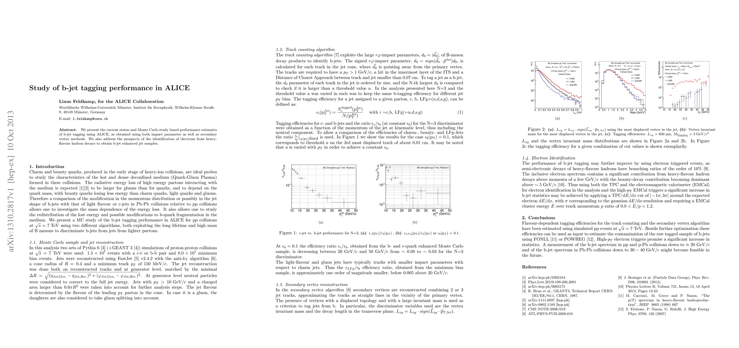 Summary: This study evaluates the performance of b-jet tagging in ALICE using Monte Carlo simulations, focusing on both impact parameter and secondary vertex methods, and explores the potential of identifying electrons from heavy-flavour hadron decays to enhance b-jet samples.
