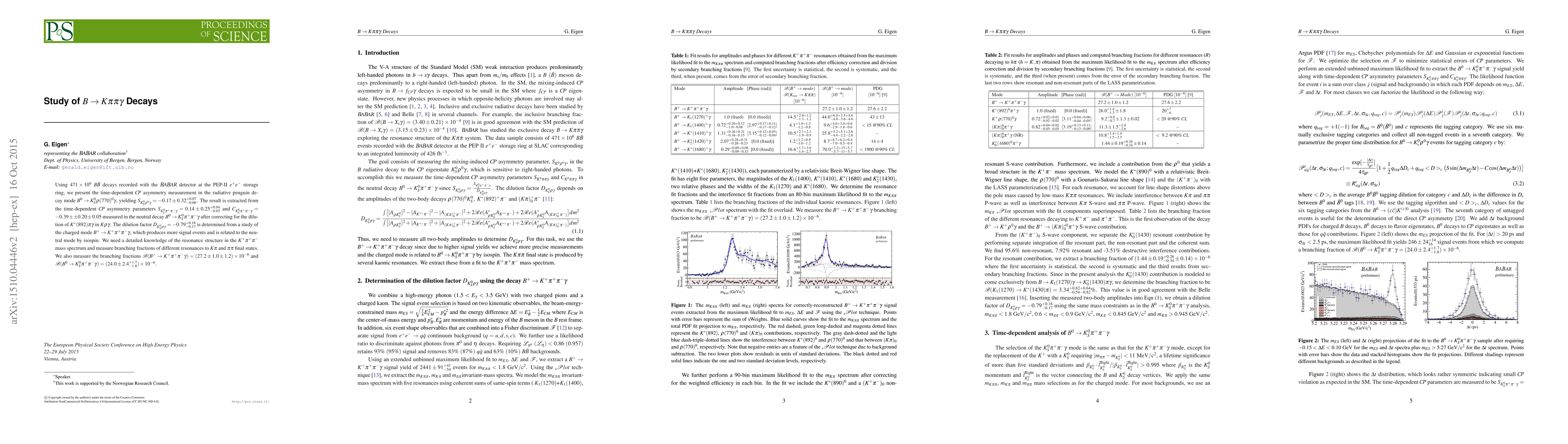Using $471 \times 10^6 ~B \bar B$ decays recorded with the \babar\ detector at the PEP-II $e^+ e^-$ storage ring, we present the time-dependent \CP\ asymmetry measurement in the radiative penguin decay mode $B^0 \rightarrow K^0_S \rho(770)^0 \gamma$, yielding $S_{K^0_S \rho^0 \gamma} =-0.17\pm 0.32^{+0.07}_{-0.06}$. Since the result is extracted from the time-dependent \CP~asymmetry parameters $S_{K^0_S \pi^+ \pi^- \gamma} =0.14\pm 0.25^{+0.04}_{-0.03}$ and $C _{K^0_S \pi^+ \pi^- \gamma} =-0.39\pm $ measured in the neutral decay $B^0 \rightarrow K^0_S \pi^+ \pi^- \gamma$, we need to correct for the dilution of $K^*(892) \pi \gamma$ in $K \rho \gamma$. The dilution factor $ D_{K^0_S \rho \gamma} =-0.79^{+0.18}_{-0.17}$ is determined from a study of the charged mode $B^+ \rightarrow K^+ \pi^+\pi^-\gamma$, which produces more signal events and is related to the neutral mode by isospin. We need detailed knowledge of the resonance structure in the $K^+ \pi^+ \pi^-$ mass spectrum and measure branching fractions of different resonances to $K \pi$ and $\pi \pi$ final states. We also measure the branching fractions ${\cal B} (B^+ \rightarrow K^+ \pi^+ \pi^- \gamma)= (27.2\pm 1.0 \pm 1.2) \times 10^{-6}$ and ${\cal B} (B^0 \rightarrow K^0_S \pi^+ \pi^- \gamma)= (24.0\pm 2.4^{+1.7}_{-1.8}) \times 10^{-6}$.
