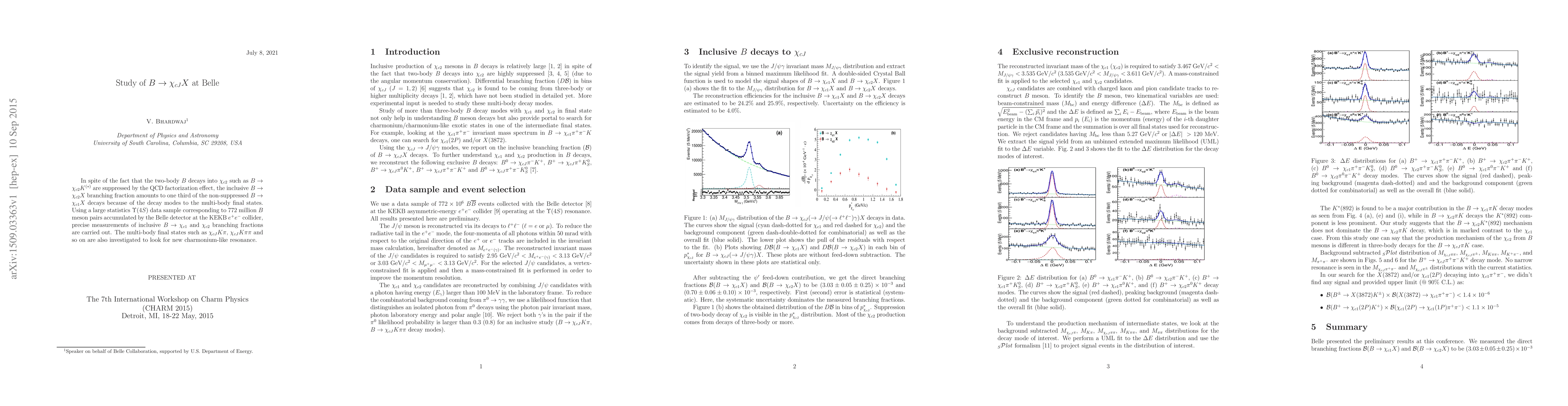In spite of the fact that the two-body $B$ decays into $\chi_{c2}$ such as $B \to \chi_{c2} K^{(*)}$ are suppressed by the QCD factorization effect, the inclusive $B \to \chi_{c2} X$ branching fraction amounts to one third of the non-suppressed $B \to \chi_{c1} X$ decays because of the decay modes to the multi-body final states. Using a large statistics $\Upsilon(4S)$ data sample corresponding to 772 million $B$ meson pairs accumulated by the Belle detector at the KEKB $e^+e^-$ collider, precise measurements of inclusive $B \to \chi_{c1}$ and $\chi_{c2}$ branching fractions are carried out. The multi-body final states such as $\chi_{cJ} K \pi$, $\chi_{cJ} K \pi \pi$ and so on are also investigated to look for new charmonium-like resonance.
