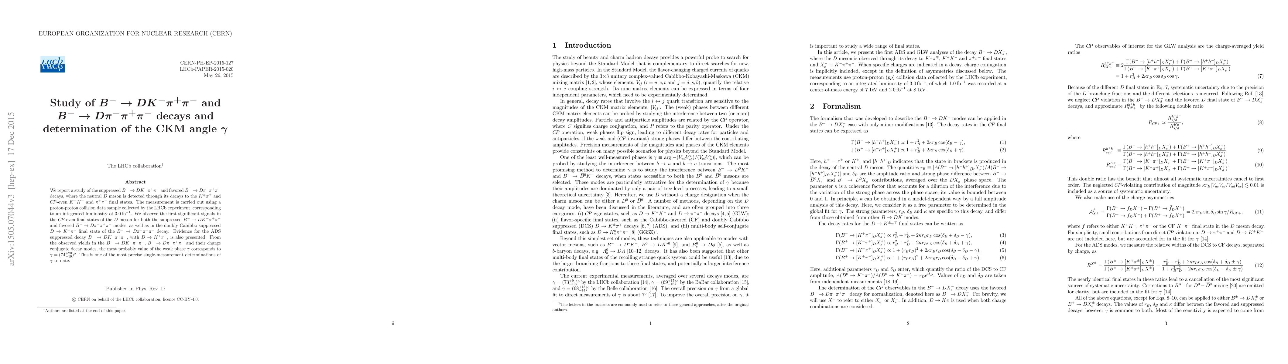 This study investigates the $B^{-}\to DK^-\pi^+\pi^-$ and $B^-\to D\pi^-\pi^+\pi^-$ decays using LHCb data, observing significant signals in CP-even final states and determining the CKM angle $\gamma$ to be $(74^{+20}_{-19})^{\rm o}$, one of the most precise single-measurement determinations to date.