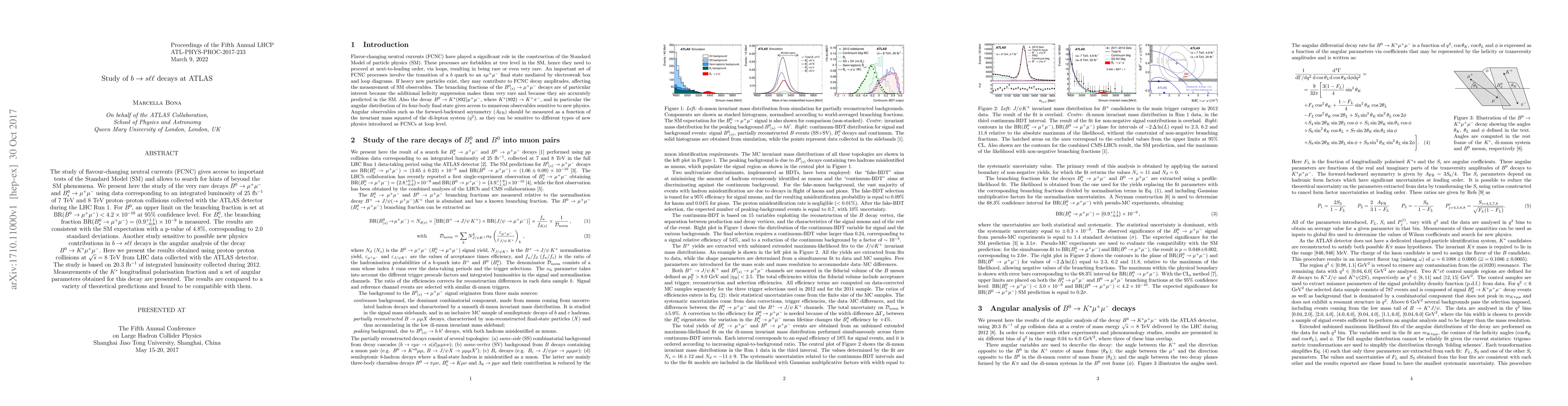 This paper investigates rare $b \to s\ell\ell$ decays at ATLAS, setting an upper limit on the $B^0 \to \mu^+\mu^-$ branching fraction and measuring $B_s^0 \to \mu^+\mu^-$, both consistent with Standard Model predictions. Additionally, an angular analysis of $B^0 \to K^*\mu^+\mu^-$ is performed, yielding results compatible with theoretical predictions.