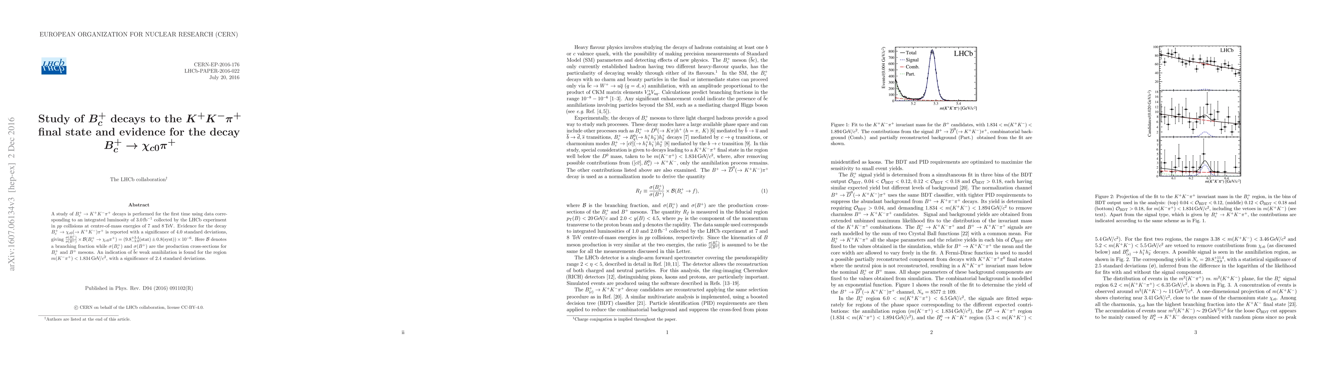 This study reports the first investigation of $B_c^+$ decays to $K^+K^-\pi^+$ using LHCb data, finding evidence for the decay $B_c^+\to\chi_{c0}\pi^+$ with a 4.0 standard deviation significance. Additionally, an indication of $\bar b c$ weak annihilation is observed in the $m(K^-\pi^+)$ region below $1.834\mathrm{\,\text{GeV}/c^2}$.