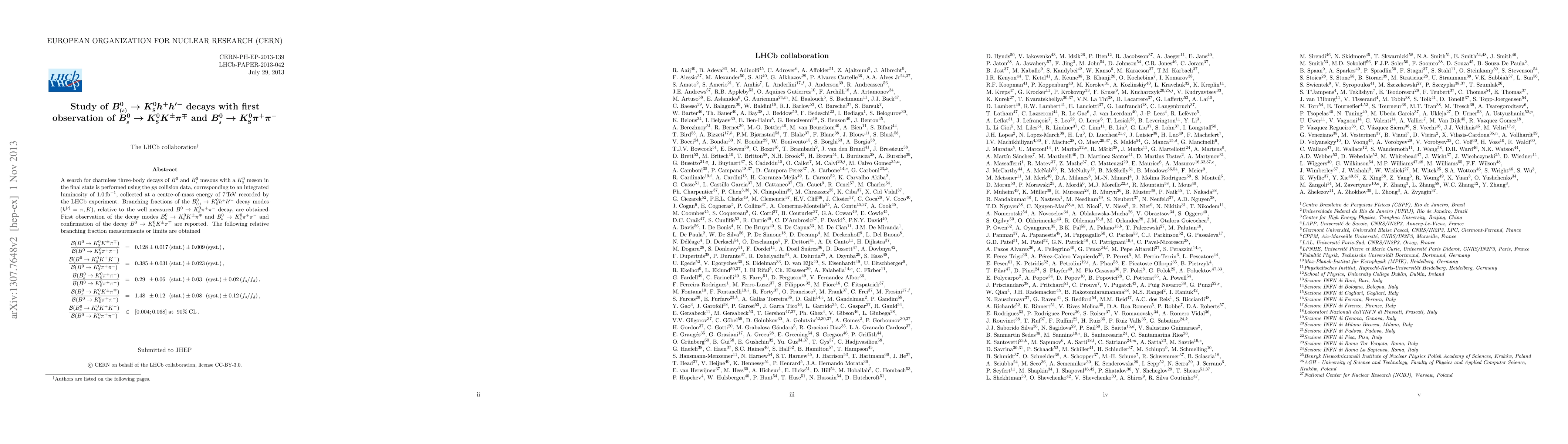 A search for charmless three-body decays of $B^0$ and $B_{s}^0$ mesons with a $K_{\rm S}^0$ meson in the final state is performed using the $pp$ collision data, corresponding to an integrated luminosity of $1.0\,\mbox{fb}^{-1}$, collected at a centre-of-mass energy of $7\mathrm{\,Te\kern -0.1em V}$ recorded by the LHCb experiment. Branching fractions of the $B_{(s)}^0 \to K_{\rm S}^0 h^{+} h^{\prime -}$ decay modes ($h^{(\prime)} = \pi, K$), relative to the well measured $B^0 \to K_{\rm S}^0 \pi^{+} \pi^{-}$ decay, are obtained. First observation of the decay modes $B_s^0 \to K_{\rm S}^0 K^{\pm} \pi^{\mp}$ and $B_s^0 \to K_{\rm S}^0 \pi^{+} \pi^{-}$ and confirmation of the decay $B^0 \to K_{\rm S}^0 K^{\pm} \pi^{\mp}$ are reported. The following relative branching fraction measurements or limits are obtained \begin{eqnarray*} \nonumber \frac{{\cal B}(B^0 \to K_{\rm S}^0 K^{\pm} \pi^{\mp})}{{\cal B}(B^0 \to K_{\rm S}^0 \pi^{+} \pi^{-})} &=& 0.128 \pm 0.017 \, ({\rm stat.}) \pm 0.009 \, ({\rm syst.}) \,, \\ \nonumber \frac{{\cal B}(B^0 \to K_{\rm S}^0 K^{+} K^{-} )}{{\cal B}(B^0 \to K_{\rm S}^0 \pi^{+} \pi^{-})} &=& 0.385 \pm 0.031 \, ({\rm stat.}) \pm 0.023 \, ({\rm syst.}) \,, \\ \nonumber \frac{{\cal B}(B_s^0 \to K_{\rm S}^0 \pi^{+} \pi^{-} )}{{\cal B}(B^0 \to K_{\rm S}^0 \pi^{+} \pi^{-})} &=& 0.29\phantom{0} \pm 0.06\phantom{0} \, ({\rm stat.}) \pm 0.03\phantom{0} \, ({\rm syst.}) \pm 0.02 \, (f_s/f_d) \,, \\ \nonumber \frac{{\cal B}(B_s^0 \to K_{\rm S}^0 K^{\pm} \pi^{\mp})}{{\cal B}(B^0 \to K_{\rm S}^0 \pi^{+} \pi^{-})} &=& 1.48\phantom{0} \pm 0.12\phantom{0} \, ({\rm stat.}) \pm 0.08\phantom{0} \, ({\rm syst.}) \pm 0.12 \, (f_s/f_d) \,, \\ \nonumber \frac{{\cal B}(B_s^0 \to K_{\rm S}^0 K^{+} K^{-} )}{{\cal B}(B^0 \to K_{\rm S}^0 \pi^{+} \pi^{-})} &\in& [0.004;0.068] \; {\rm at \;\; 90\% \; CL} \,. \end{eqnarray*}