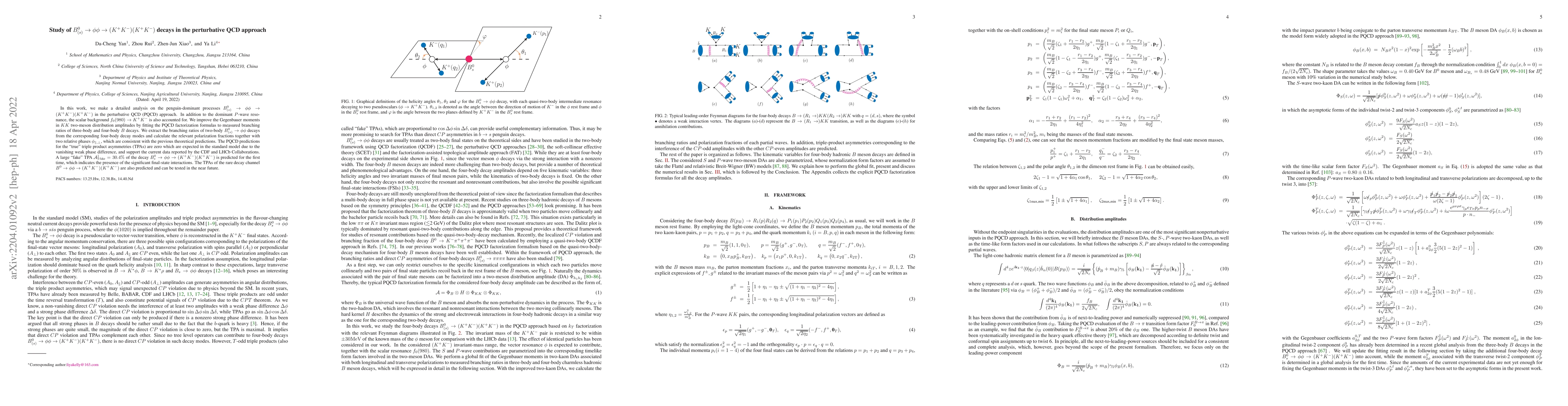 This study analyzes penguin-dominant processes $B_{(s)}^0 \to \phi\phi \to (K^+K^-)(K^+K^-)$ using the perturbative QCD approach, accounting for both $P$-wave resonances and scalar background $f_0(980)$. The research improves the Gegenbauer moments in $KK$ two-meson distribution amplitudes and predicts zero "true" triple product asymmetries consistent with the standard model, while predicting a large "fake" TPA for $B^0_s$ decays indicating significant final-state interactions.