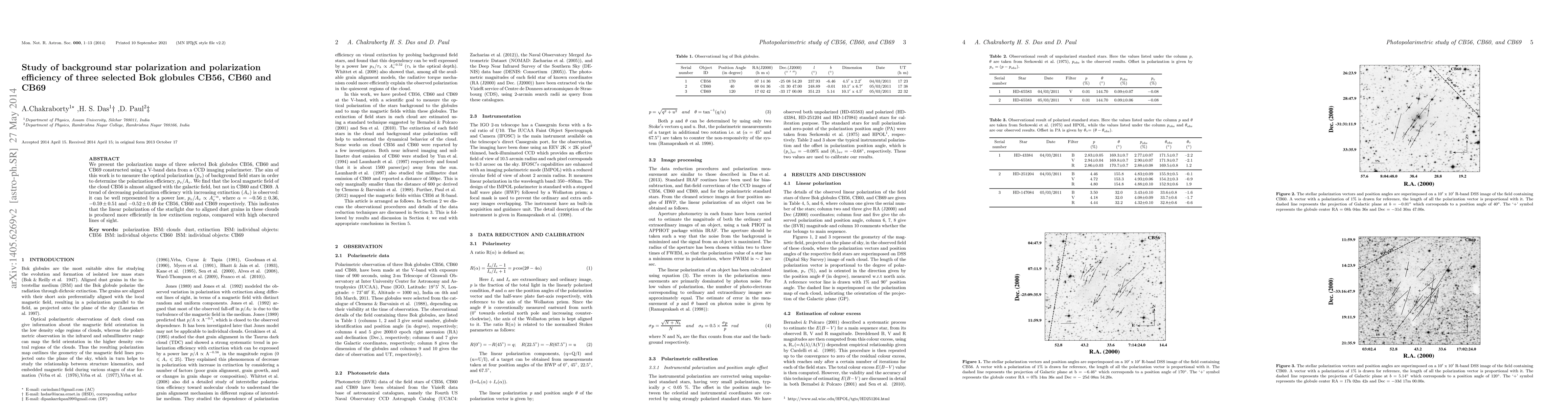 We present the polarization maps of three selected Bok globules CB56, CB60 and CB69 constructed using a V-band data from a CCD imaging polarimeter. The aim of this work is to measure the optical polarization ($p_v$) of background field stars in order to determine the polarization efficiency, $p_v/A_v$. We find that the local magnetic field of the cloud CB56 is almost aligned with the galactic field, but not in CB60 and CB69. A trend of decreasing polarization efficiency with increasing extinction ($A_v$) is observed: it can be well represented by a power law, $p_v/A_v \propto A_v^{-\alpha}$, where $\alpha = -0.56 \pm 0.36$, $-0.59 \pm 0.51$ and $-0.52 \pm 0.49$ for CB56, CB60 and CB69 respectively. This indicates that the linear polarization of the starlight due to aligned dust grains in these clouds is produced more efficiently in low extinction regions, compared with high obscured lines of sight.