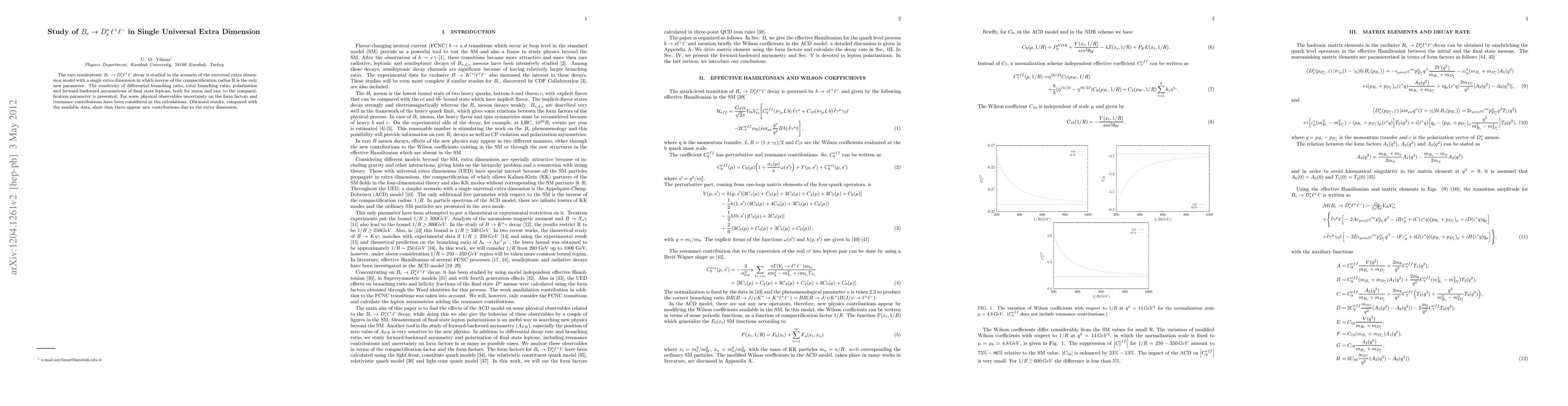 The rare semileptonic Bc-> D_s^* \ell^+ \ell^- decay is studied in the scenario of the universal extra dimension model with a single extra dimension in which inverse of the compactification radius R is the only new parameter. The sensitivity of differential branching ratio, total branching ratio, polarization and forward-backward asymmetries of final state leptons, both for muon and tau, to the compactification parameter is presented. For some physical observables uncertainty on the form factors and resonance contributions have been considered in the calculations. Obtained results, compared with the available data, show that there appear new contributions due to the extra dimension.