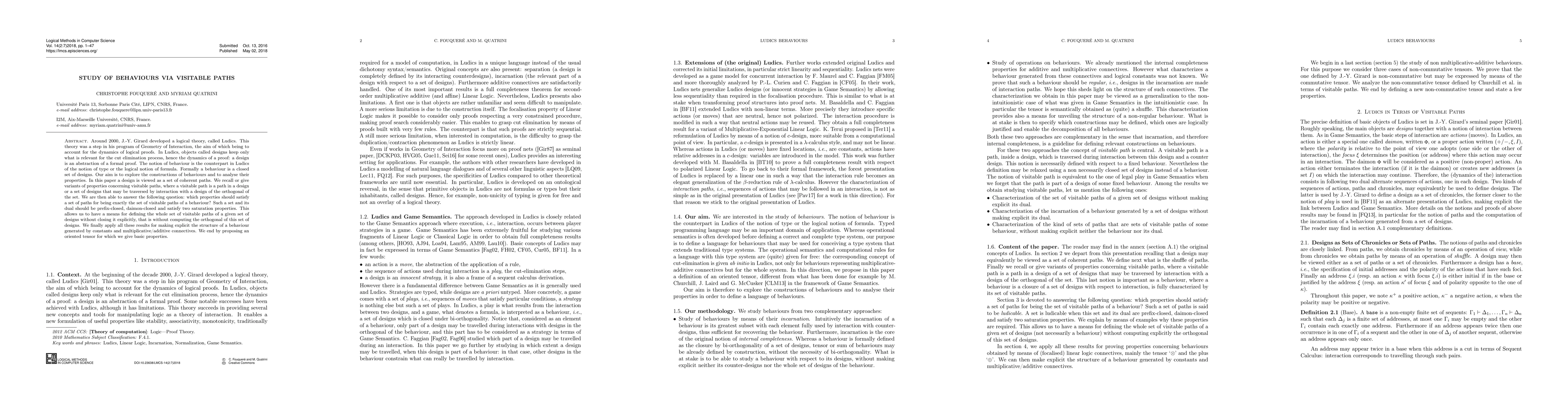 Around 2000, J.-Y. Girard developed a logical theory, called Ludics. This theory was a step in his program of Geometry of Interaction, the aim of which being to account for the dynamics of logical proofs. In Ludics, objects called designs keep only what is relevant for the cut elimination process, hence the dynamics of a proof: a design is an abstraction of a formal proof. The notion of behaviour is the counterpart in Ludics of the notion of type or the logical notion of formula. Formally a behaviour is a closed set of designs. Our aim is to explore the constructions of behaviours and to analyse their properties. In this paper a design is viewed as a set of coherent paths. We recall or give variants of properties concerning visitable paths, where a visitable path is a path in a design or a set of designs that may be traversed by interaction with a design of the orthogonal of the set. We are then able to answer the following question: which properties should satisfy a set of paths for being exactly the set of visitable paths of a behaviour? Such a set and its dual should be prefix-closed, daimon-closed and satisfy two saturation properties. This allows us to have a means for defining the whole set of visitable paths of a given set of designs without closing it explicitly, that is without computing the orthogonal of this set of designs. We finally apply all these results for making explicit the structure of a behaviour generated by constants and multiplicative/additive connectives. We end by proposing an oriented tensor for which we give basic properties.