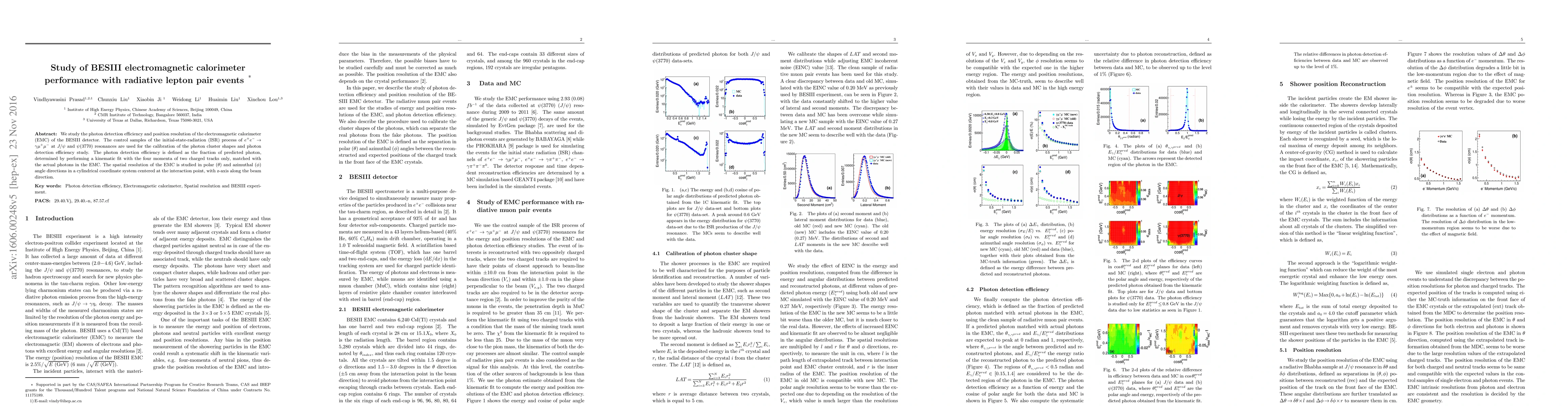 This study evaluates the photon detection efficiency and position resolution of the BESIII detector's electromagnetic calorimeter using radiative lepton pair events from $e^+e^-\rightarrow \gamma \mu^+\mu^-$ at $J/\psi$ and $\psi(3770)$ resonances. The efficiency is determined by matching predicted photons from kinematic fits to actual EMC detections, while spatial resolution is analyzed in polar and azimuthal angles.