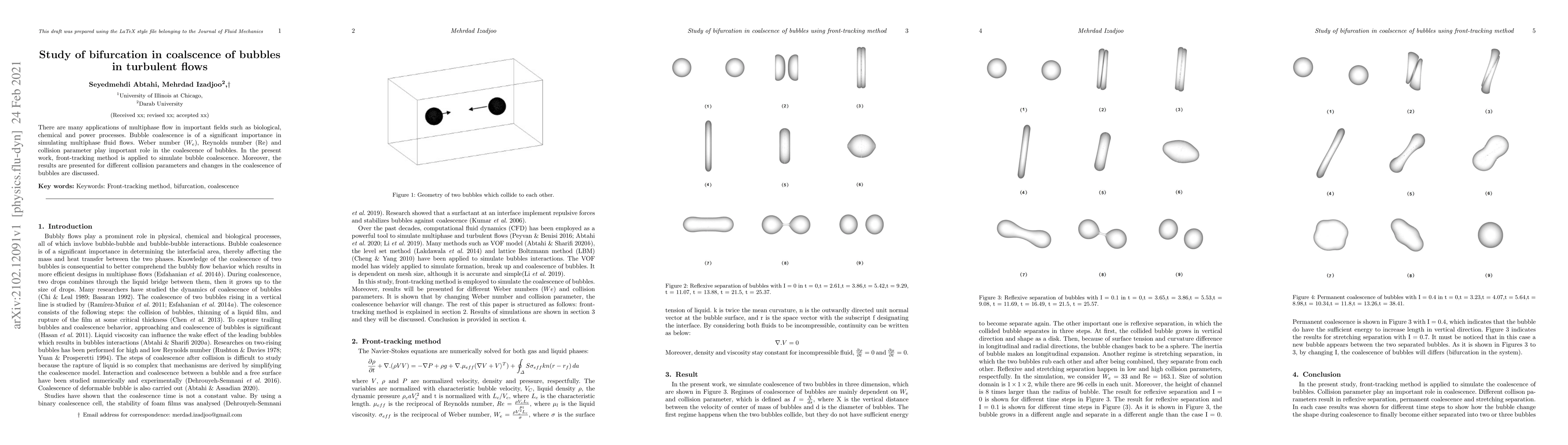 This study uses the front-tracking method to simulate bubble coalescence in multiphase flow, focusing on the effects of Weber number, Reynolds number, and collision parameters on the process. The research discusses variations in bubble coalescence under different collision parameters.