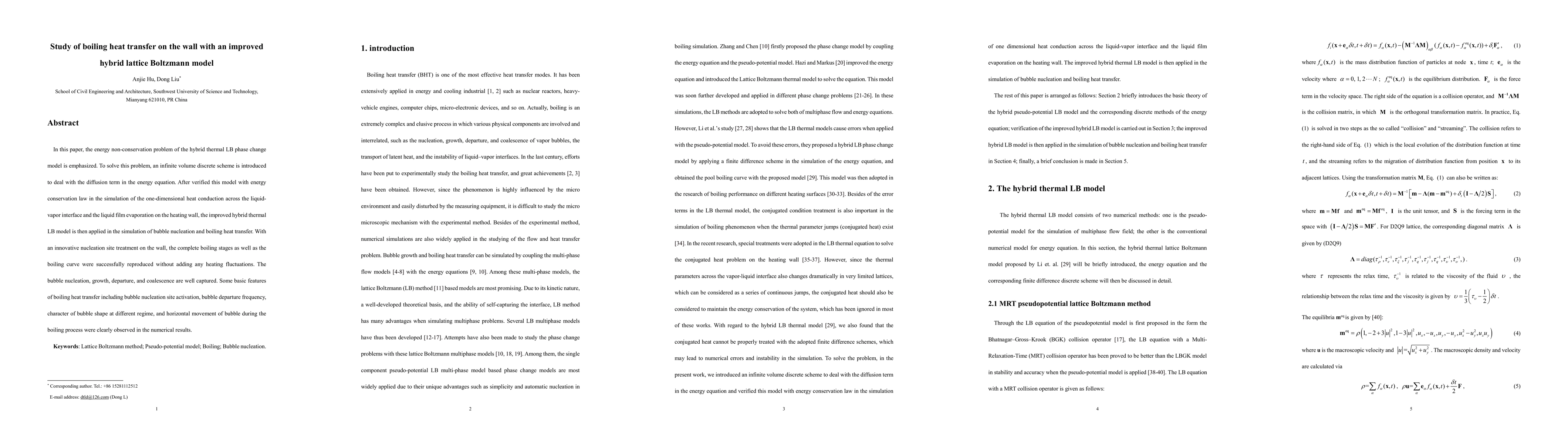 This paper introduces an improved hybrid lattice Boltzmann model to address energy non-conservation issues in thermal simulations, successfully applying it to simulate bubble nucleation and boiling heat transfer, capturing key boiling phenomena without external heating fluctuations. The model accurately reproduces complete boiling stages and the boiling curve.